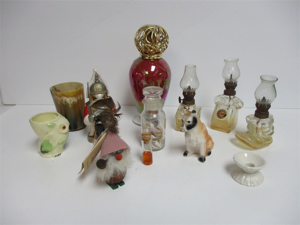 A group deal!  3 Miniature Hurricane lamps, Oil lamp in the shape of a Perfume Bottle, A Horn cup with a crack in the bottom and other items.  See pictures.