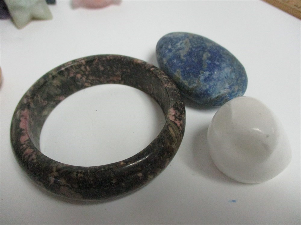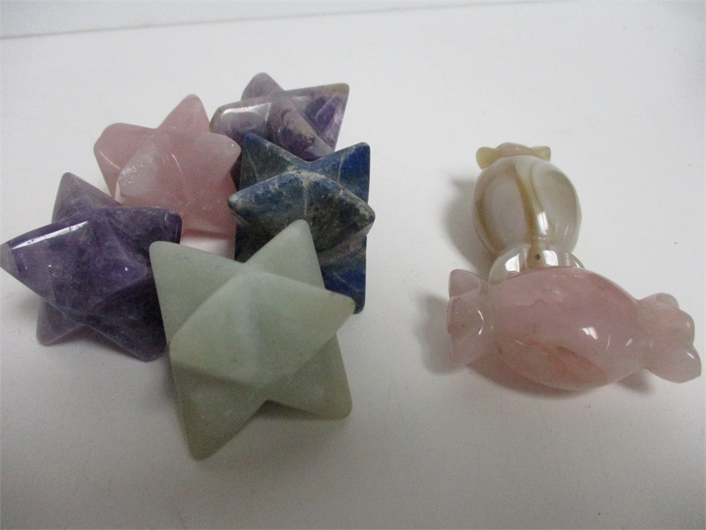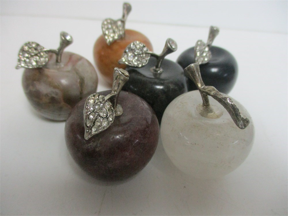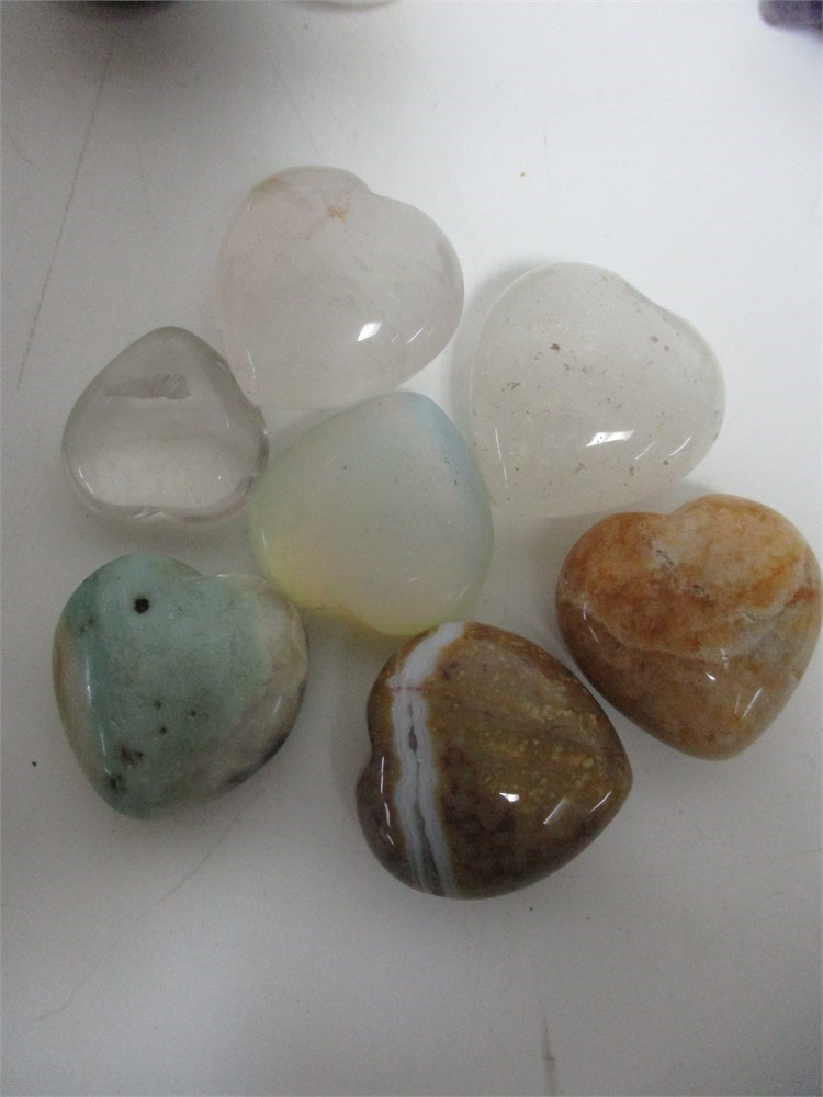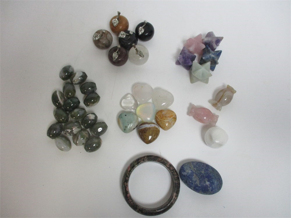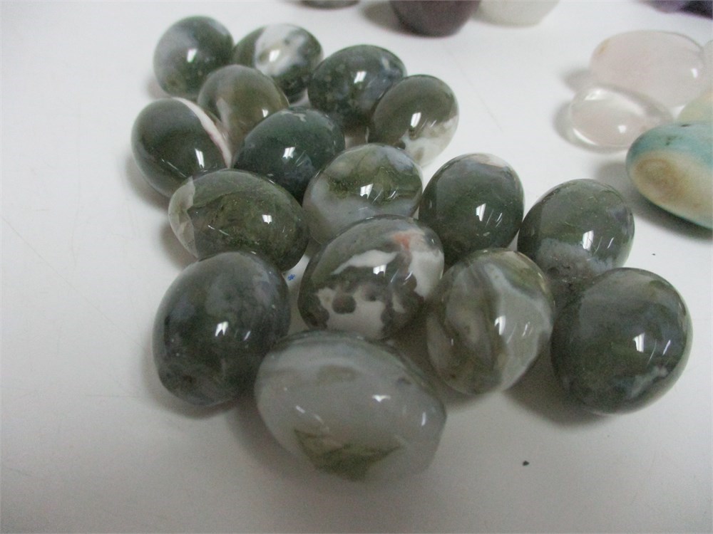 A nice lot of Multi colored Polished stone miniatures in different shapes, Apples, Candies, Hearts, Oval Beads and more.  All seem to be in good condition.
