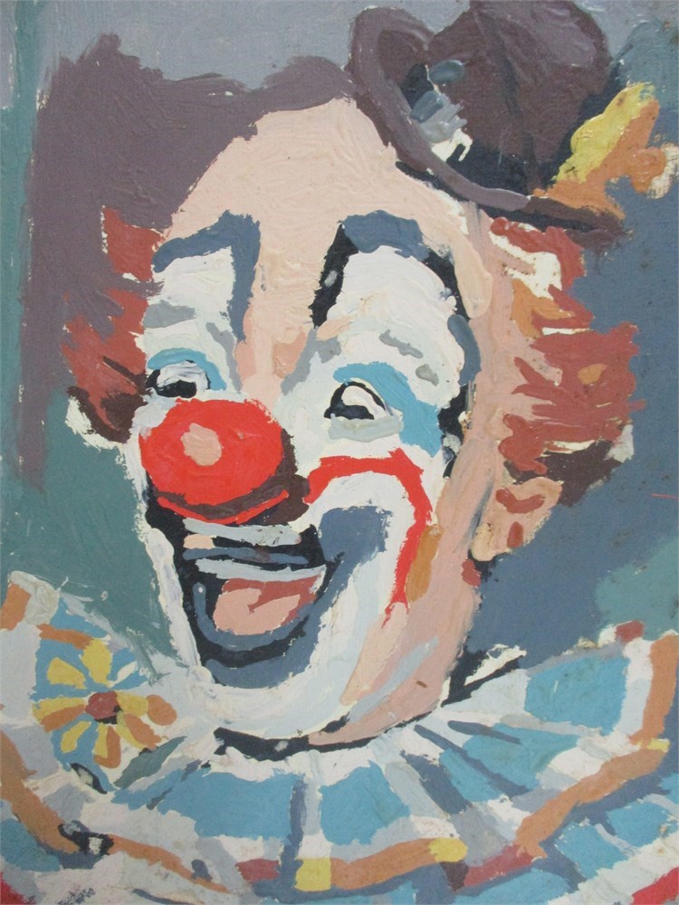 An original oil painting of a Circus Clown, signed JSK '66.  Loosely framed and needs some cleaning, but a nice colorful piece of original art. 11x14.  Is this an old paint by number and who is the clown?  Let us know if you want the information published or keep it to yourself and buy it cheap.