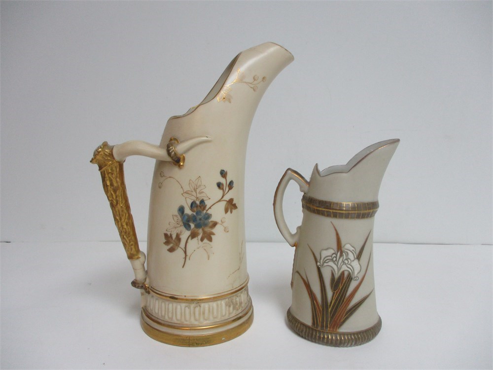 Two very nice Pitcher/Ewers.  The larger is Royal Worcester "Tusk Jug" with the Royal Worcester Porcelain Mark 1888-1891. 9" Tall.  It is Hand Painted, has some gilt loss to the handle and some stain to the bottom rim. The Smaller Aesthetic Movement Porcelain pitcher 1860-1900 is Hand Painted, signed on the bottom and is 6" Tall.