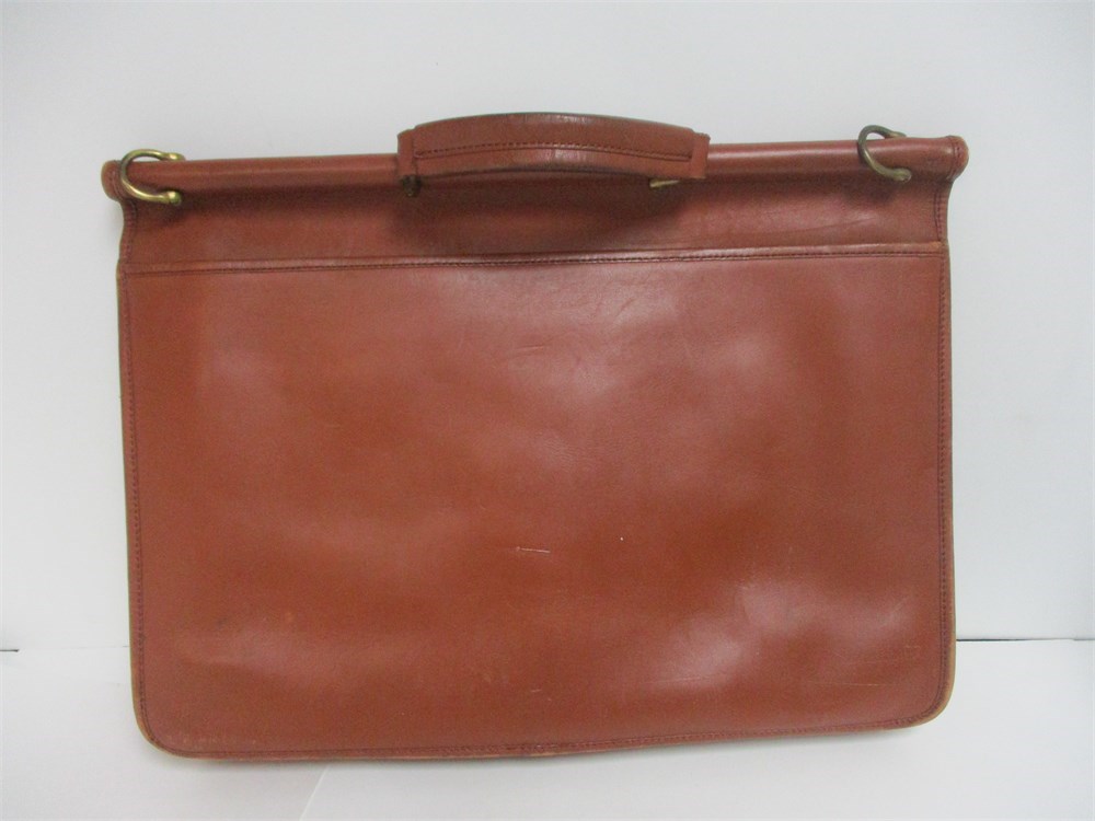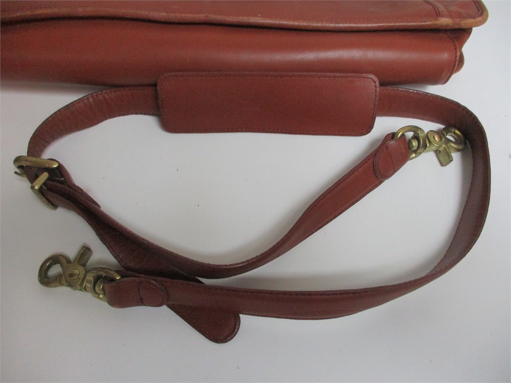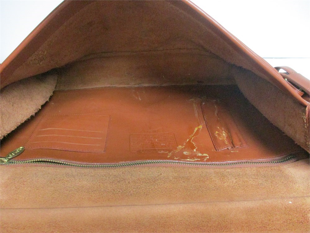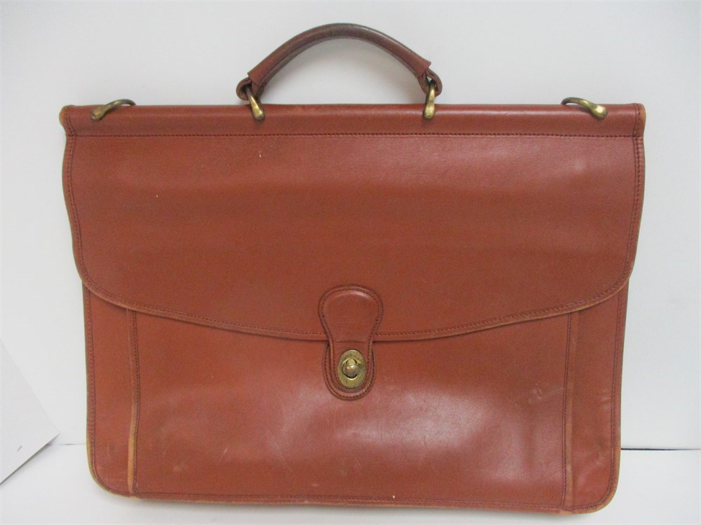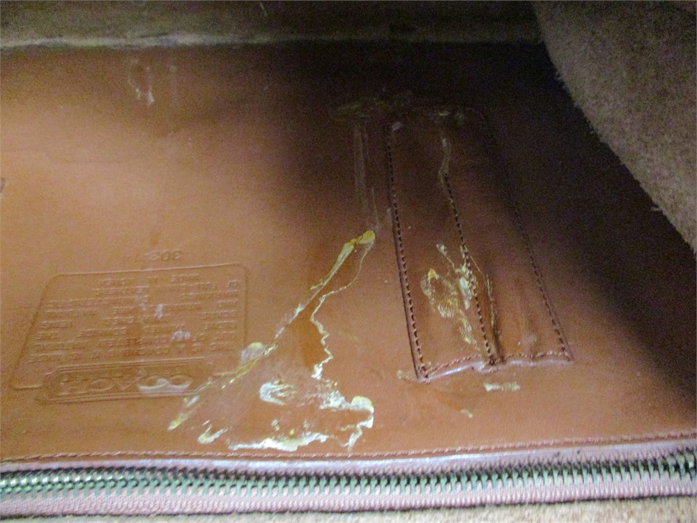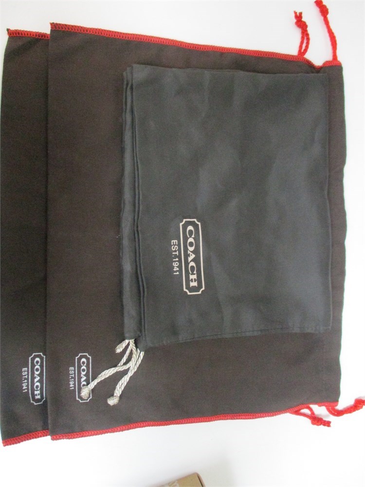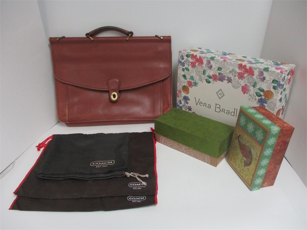 A Large, Vintage, Coach Messenger Bag in Brown Saddle Leather with Toggle Closure, Brass hardware and Shoulder Strap. Measures 14 x 15".   The Bag shows some inside staining and the Leather is worn from heavy use.  It is still in good usable condition if you want a vintage look.  Also in the group are some Coach cloth storage bags and there are 3 cardboard decorator boxes, 1 Vera Bradley.