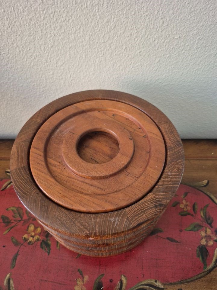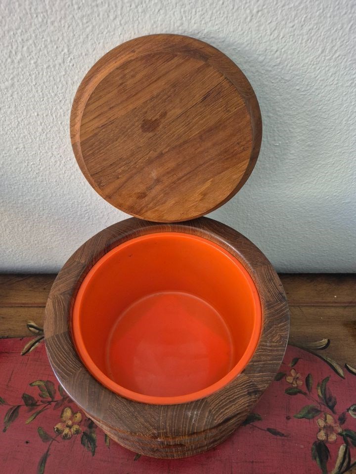 This 1960s wooden ice bucket has a great Danish modern / mid century modern look, designed by Jens Quistgaard for Dansk. It's made of staved teak wood, with banded horizontal ribs around the bucket and a matching circular lid with an inset handle. The bucket has a plastic lining and is marked on the bottom Dansk