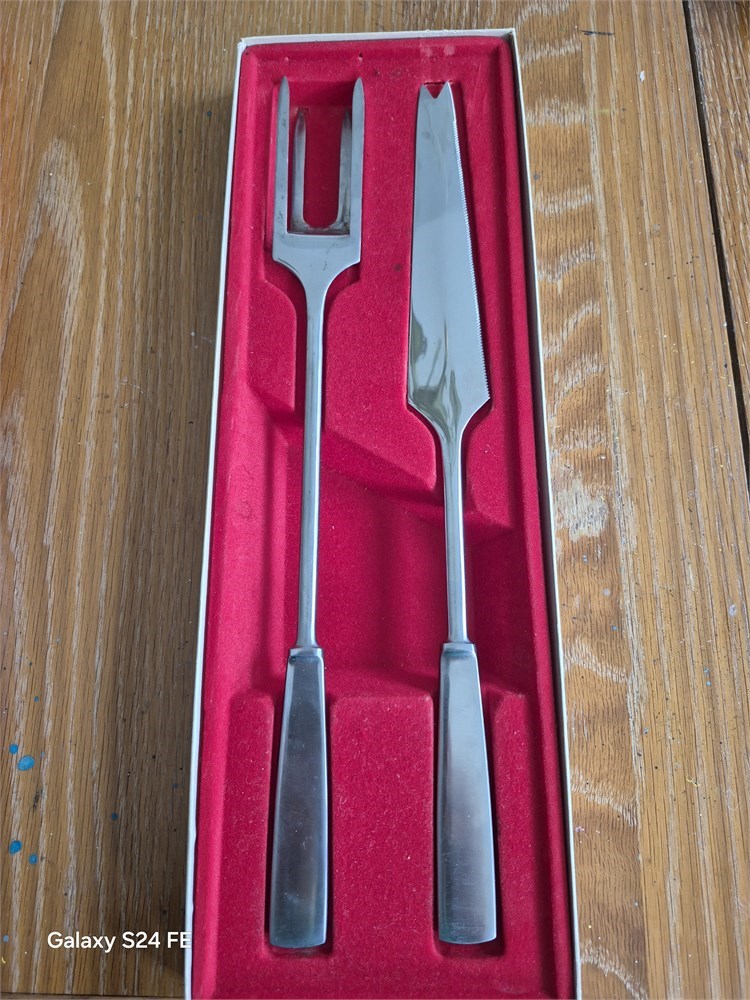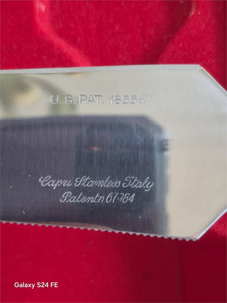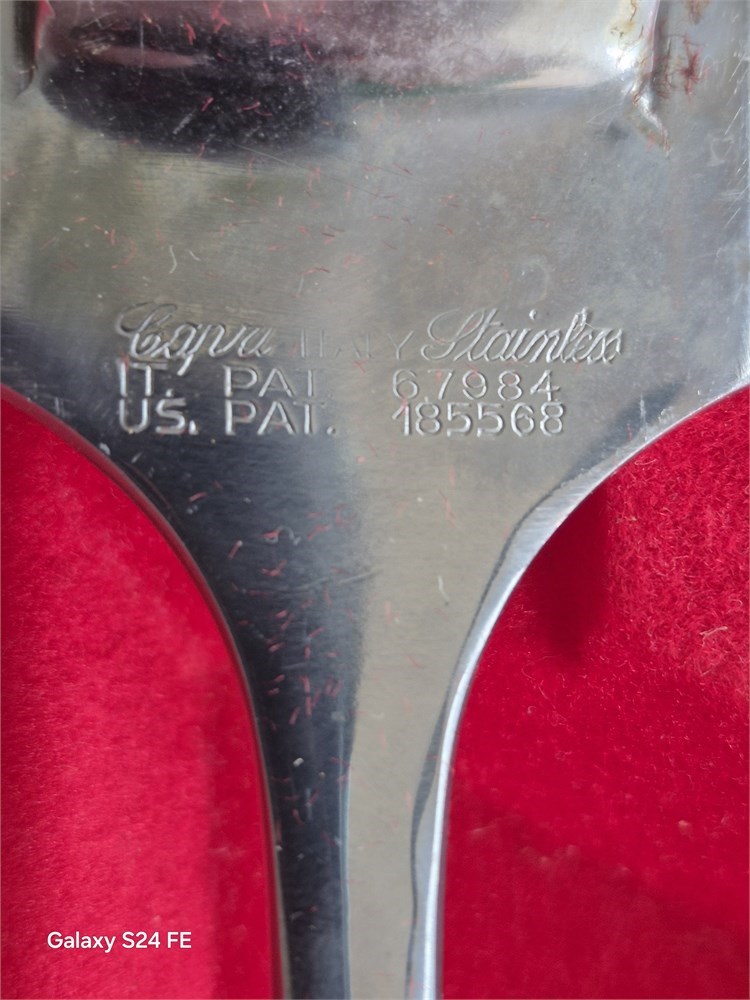 NICE OLD MID CENTURY STAINLESS GRILL SET THAT IS ITALIAN MADE. IT IS CALLED CAPRI AND IT COMES IN THE ORIGINAL CARTON WITH ORIGINAL PAPERWORK. BOTH PIECES ARE STAINLESS AND BOTH MEASURE ABOUT 15 1/2" EACH. KIND OF AN UNUSUAL DESIGN TO EACH PIECE. THE PAIR ARE FOUND IN EXCELLENT CONDITION! THERE ARE NO DAMAGES .