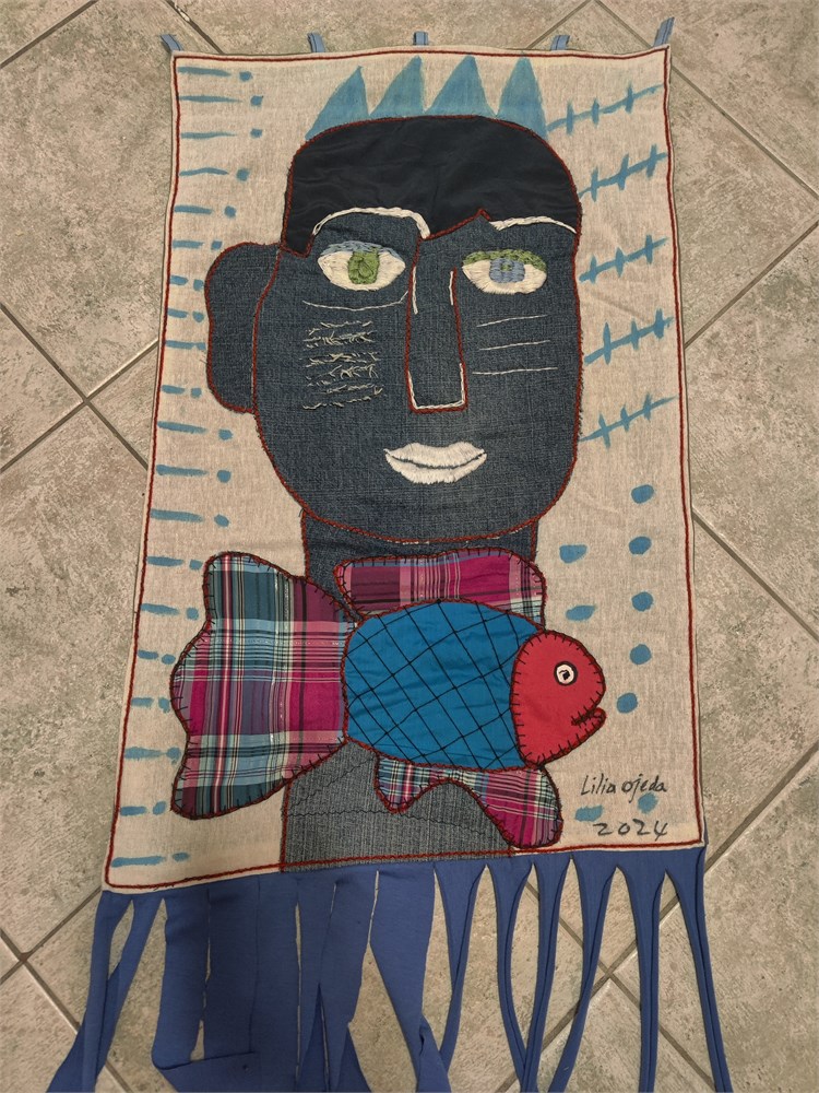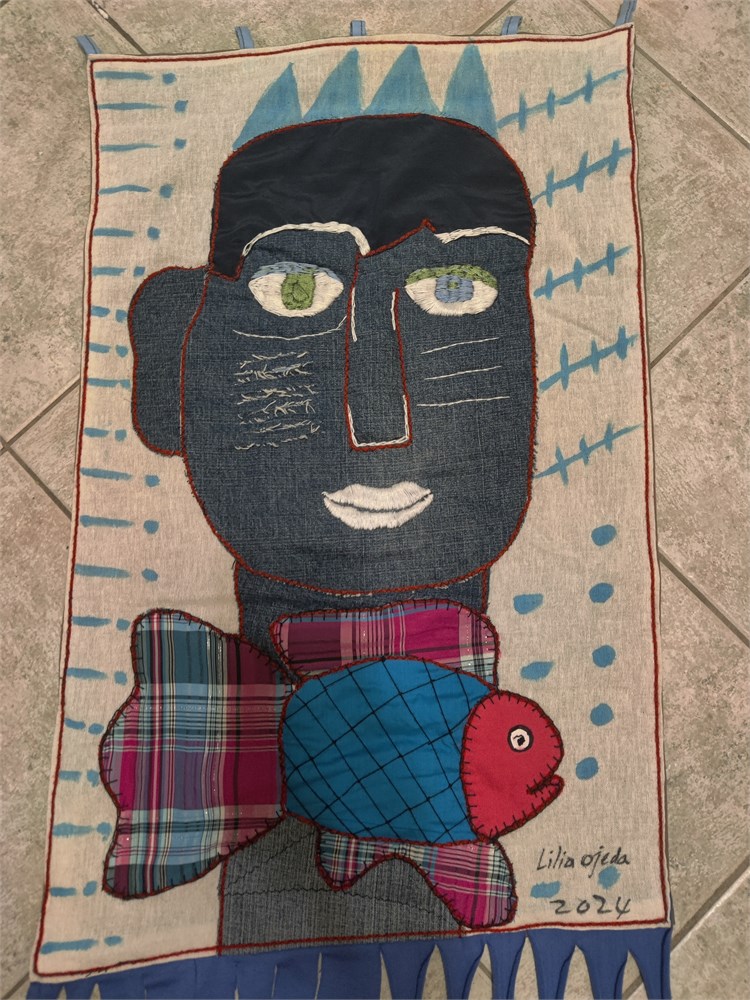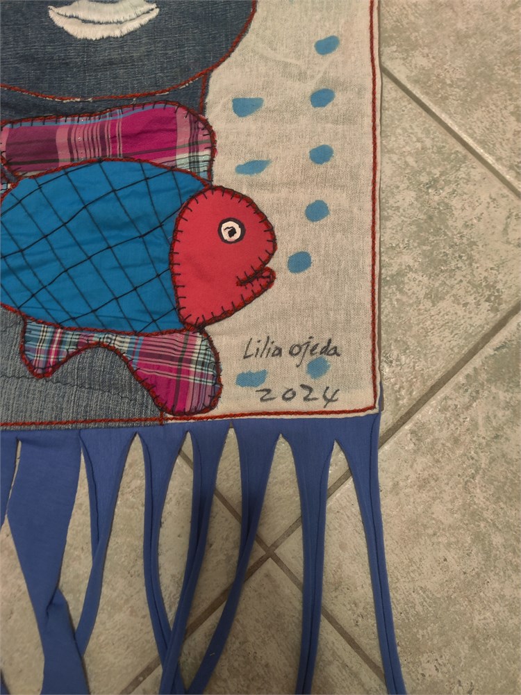 Patchwork art quilted window shade. Peace is signed Lilia Ojeda 2024. Item measures about 40 in long with streamers and 22 in wide.