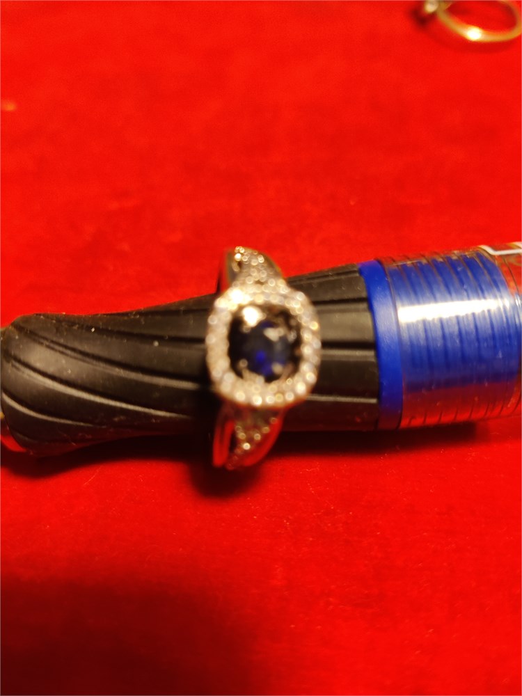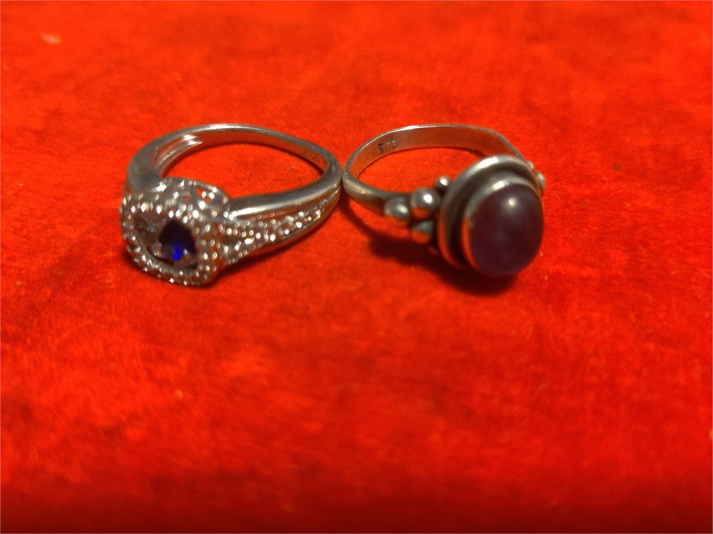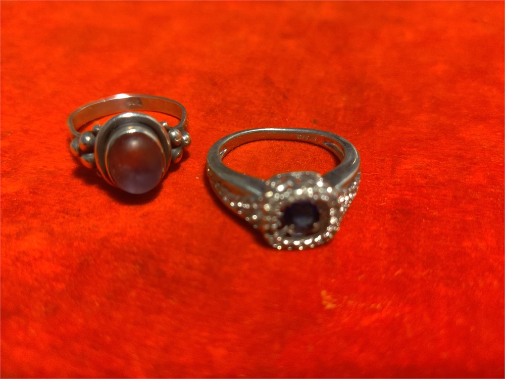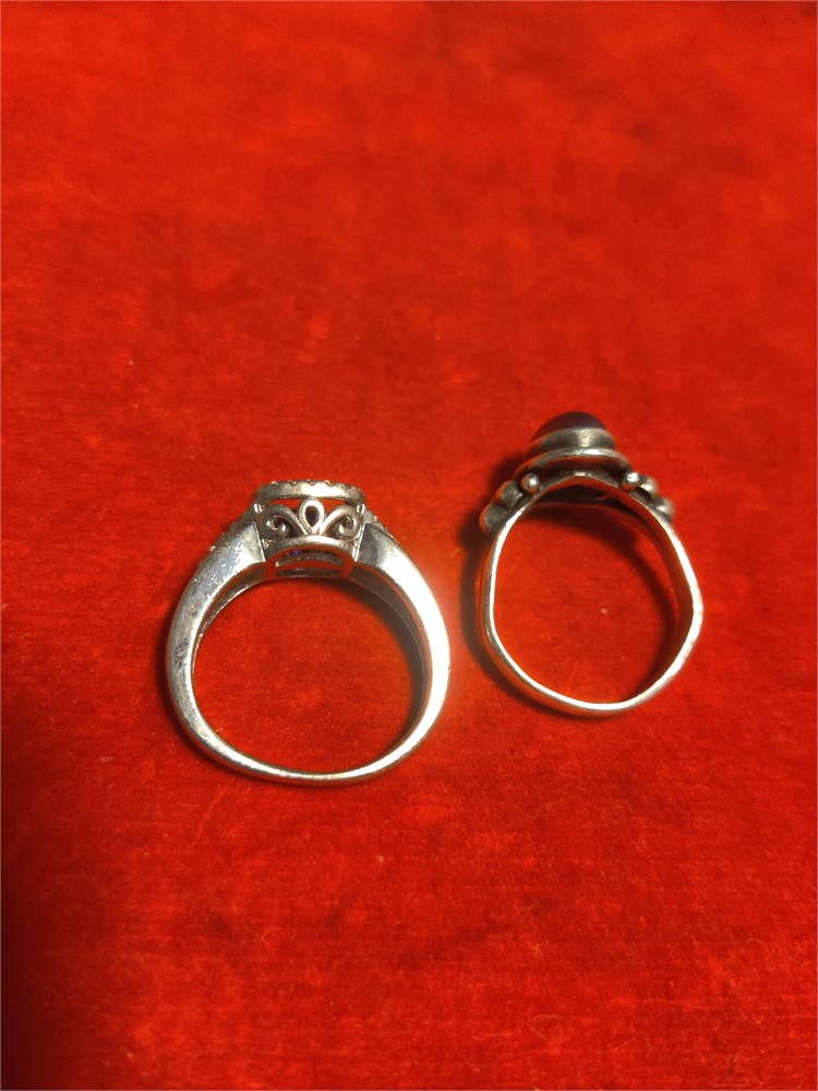Pair of sterling silver rings. Total weight is 7.42 g. One ring has purple center stone the other has blue.