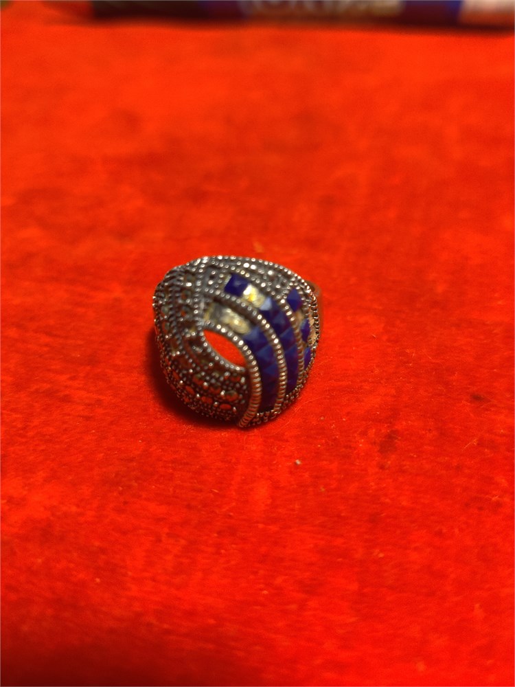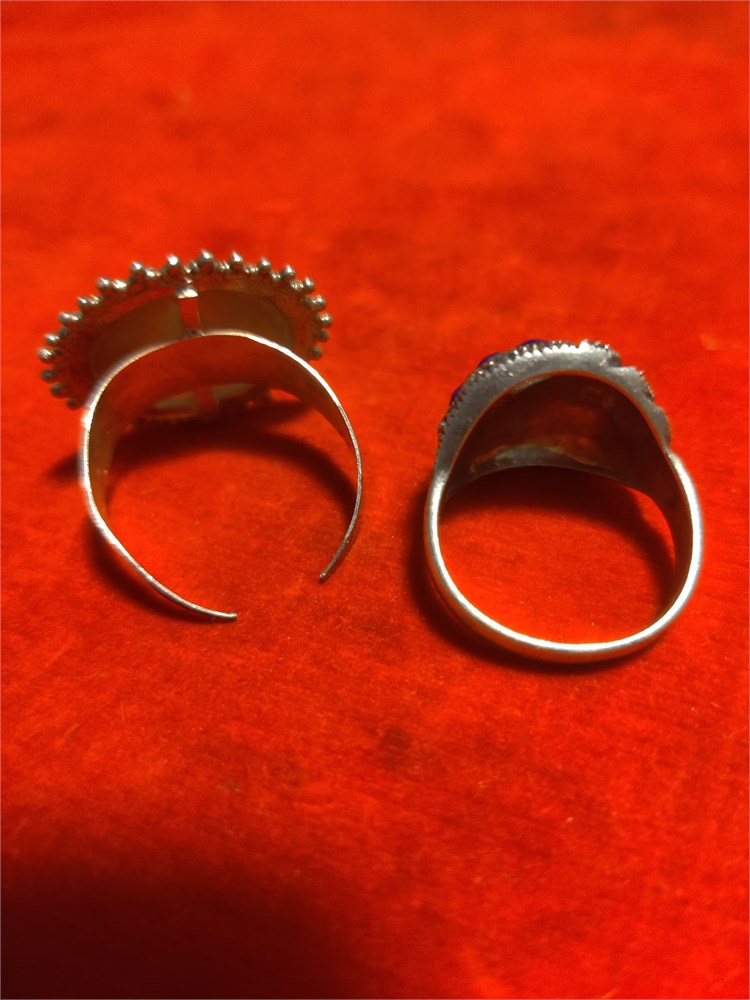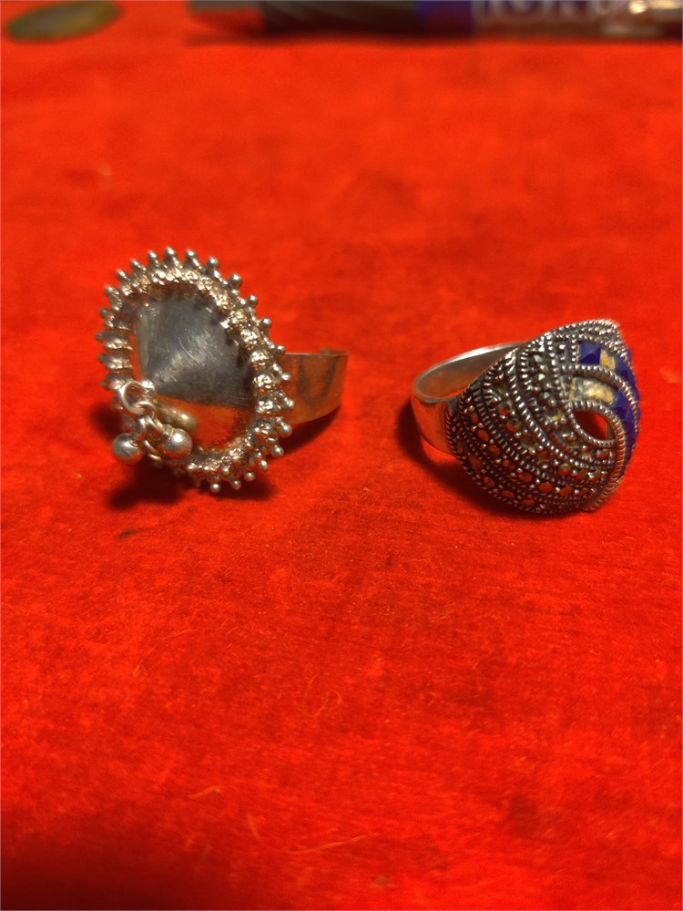 Two sterling silver rings. One ring has rhinestone and blue gemstones. Ring is missing a few of the blue gemstones. Total weight is 10.24 g.