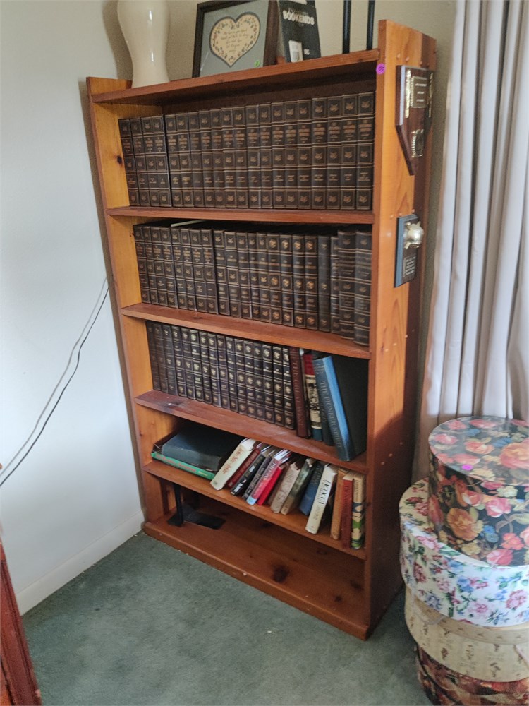 Nice wood bookshelf. Shelves are slotted in and not adjustable. Shelf stands approximately 60 in tall and 42 in wide. Books on shelf are not included with the shelf.