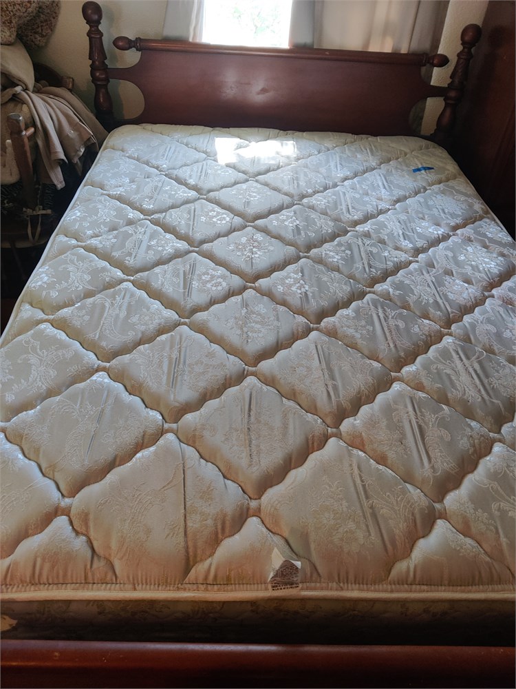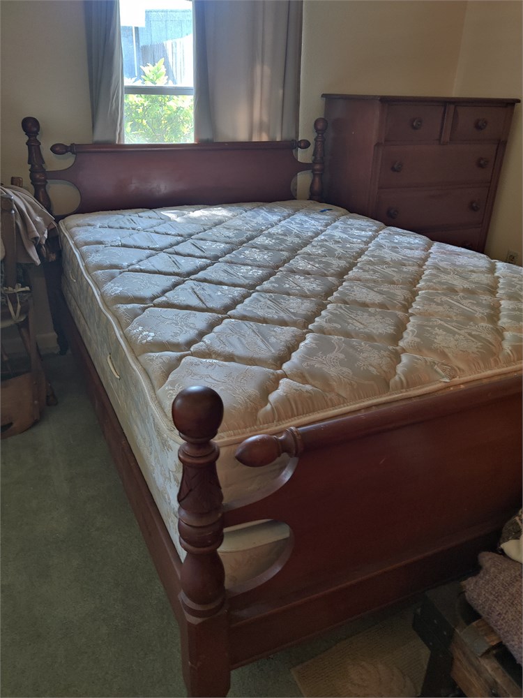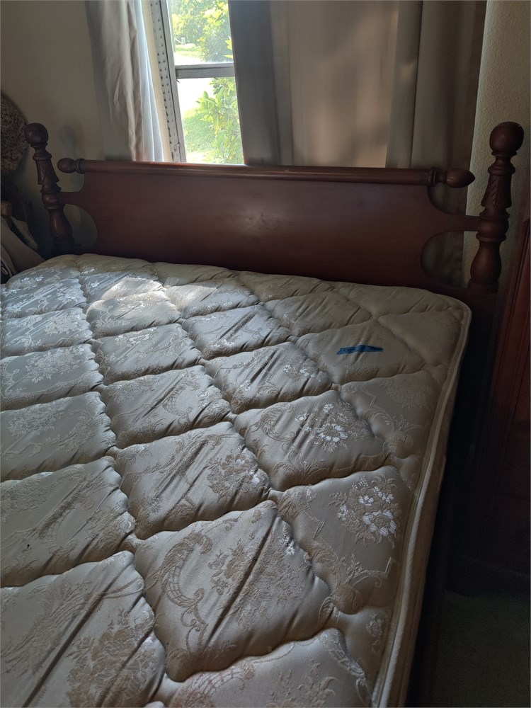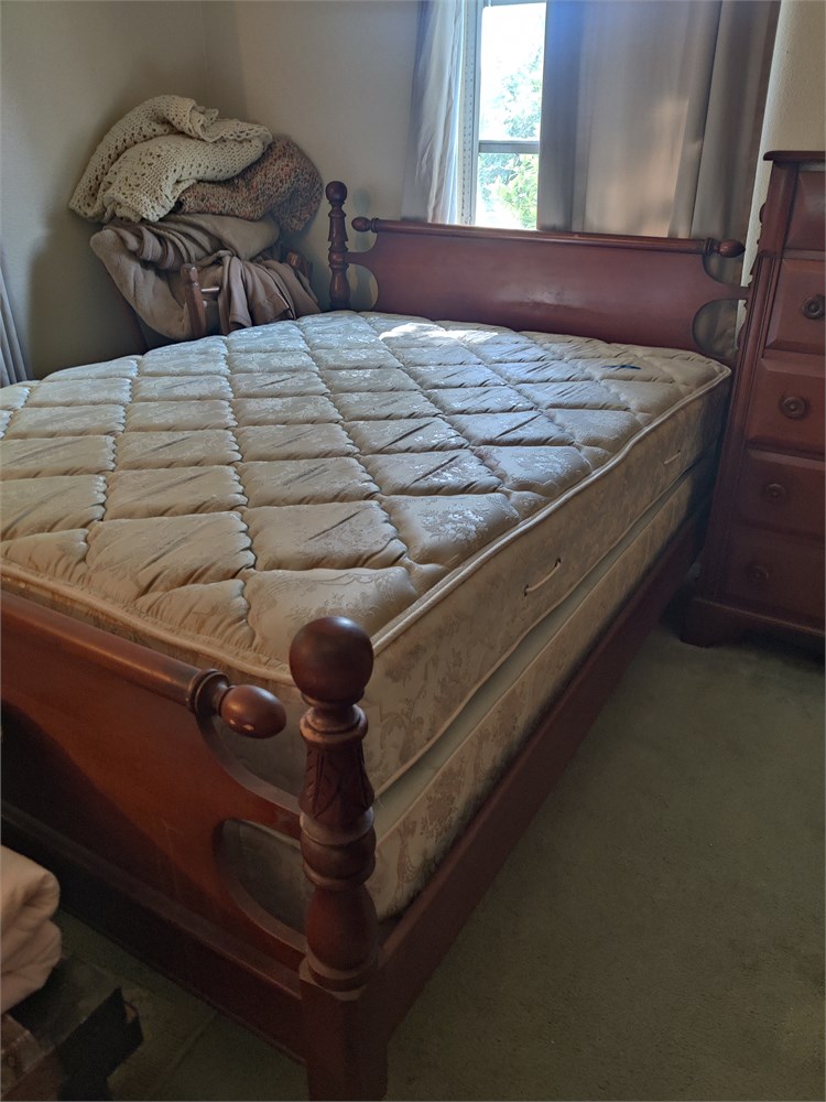 Nice wooden bed frame fits full size box spring and mattress. Box spring and mattress are available with this bed looks like mattress is lightly used.