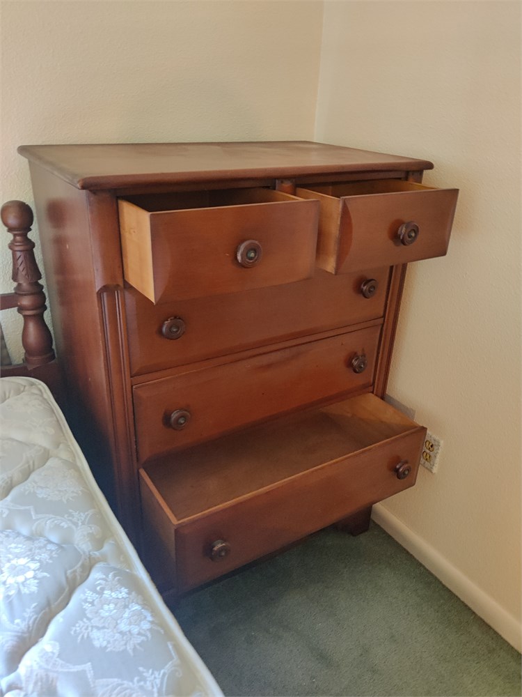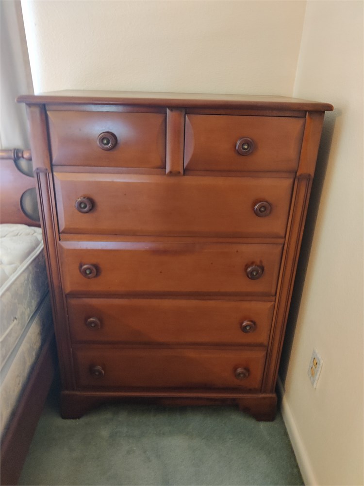 Very nice solid wood chest of drawers. Has four full-size drawers and two split drawers at top. This is a matching piece to the full size bed frame in previous listing.