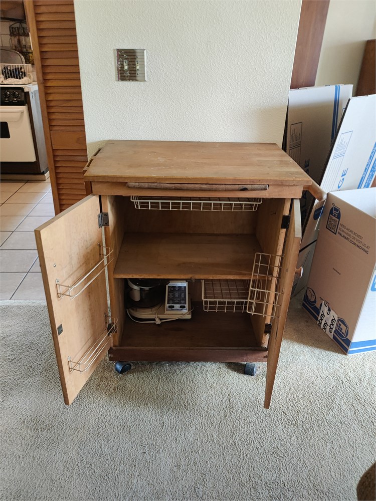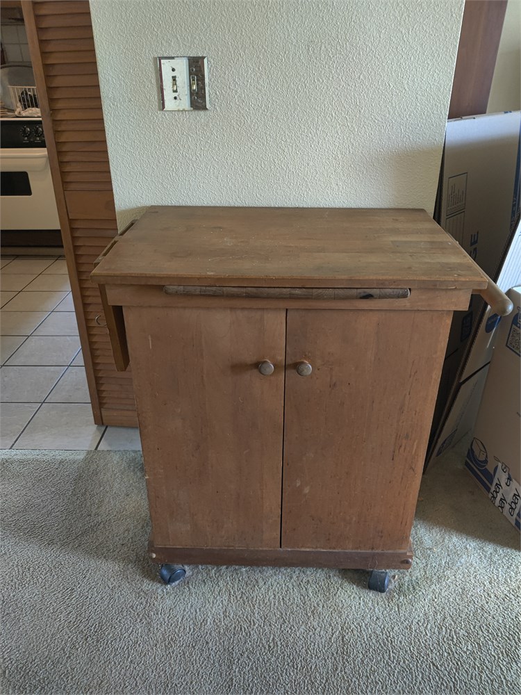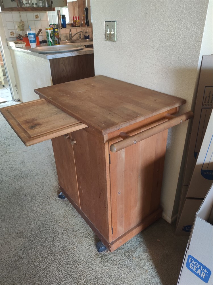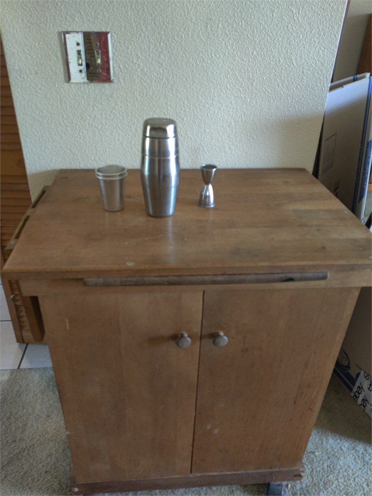 Nice little wooden bar cart or floating island. Item is solid wood. Looks to be in good used condition. This item is located at the Northport House and will need to be picked up on Tuesday.