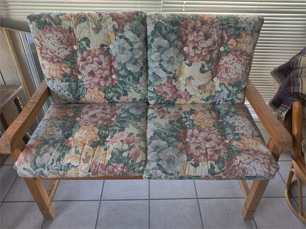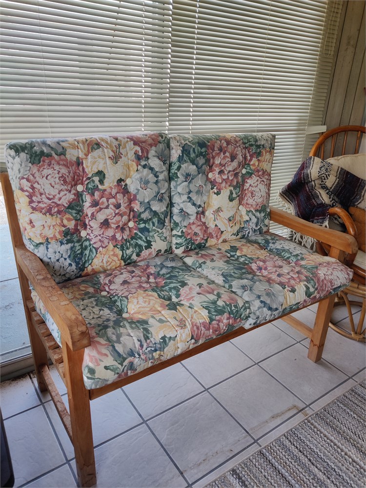 Nice wooden loveseat with floral cushions. Item has some water staining on arms and legs. Item measures approximately 48 in wide 24 in deep and stands about 22 in to top of cushion.