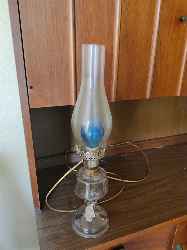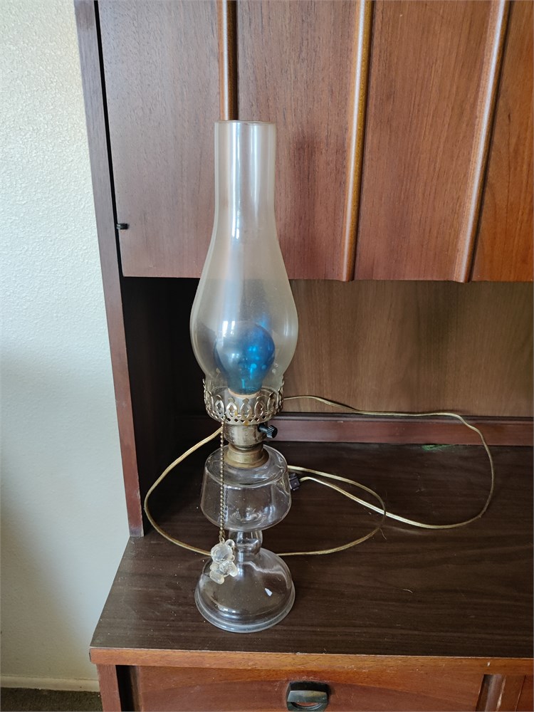 Glass lantern with glass chimney. Light has been converted to electric. Lantern stands about 22 in tall.