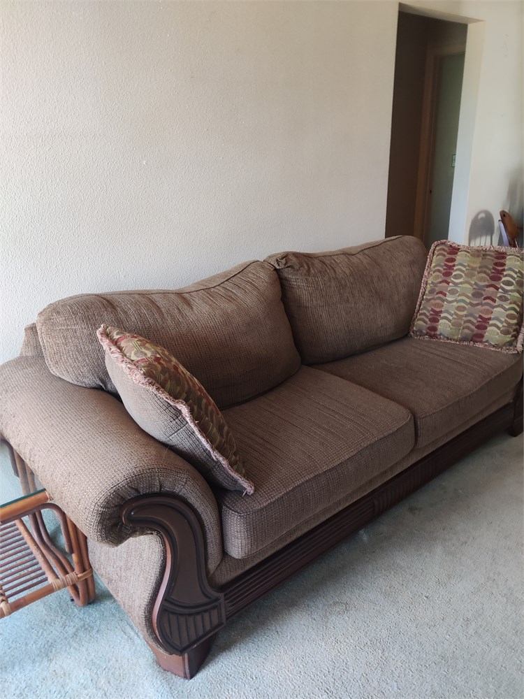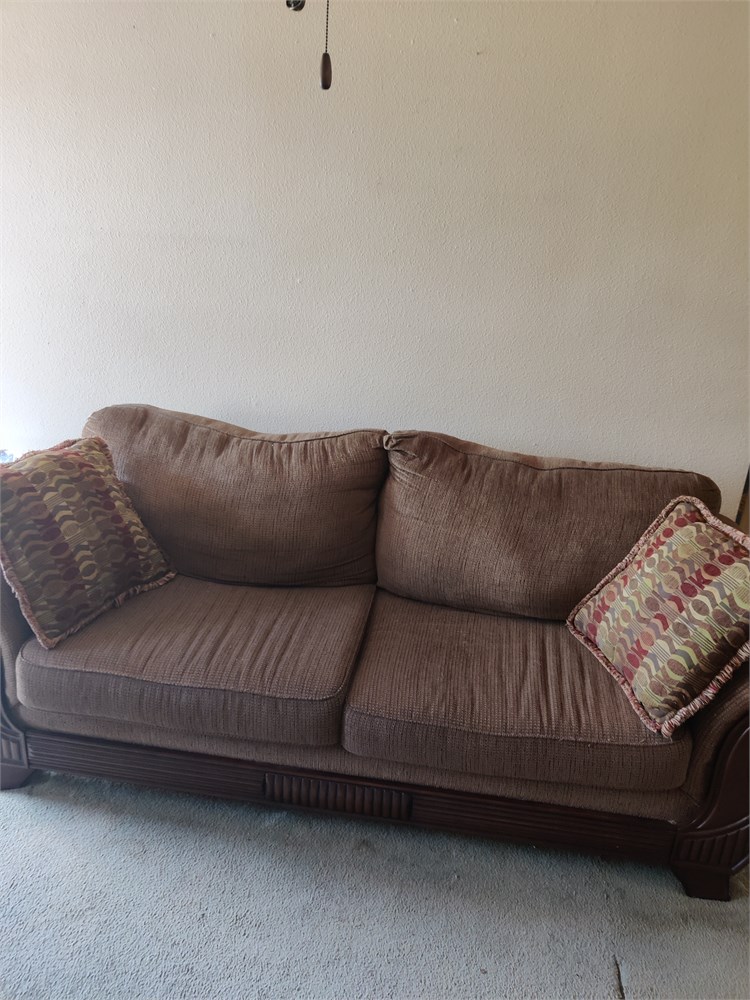 Nice brown fabric and wood couch. Couch measures 84 in long and 36 in deep. Looks to be in good used condition. Comes with two pillows. Pet free smoke-free house.