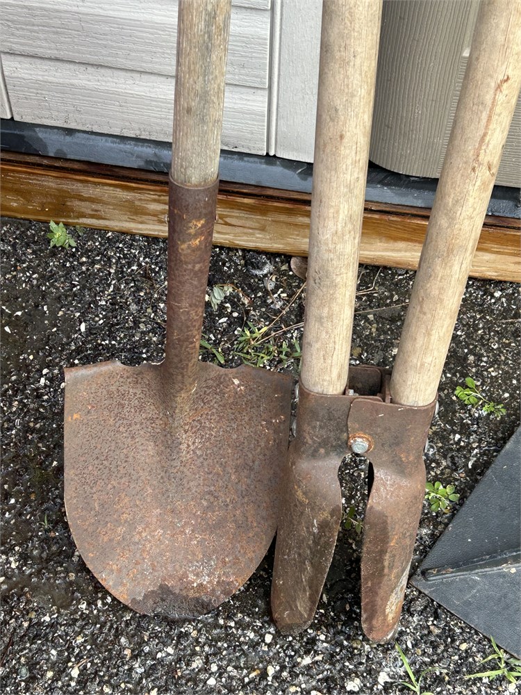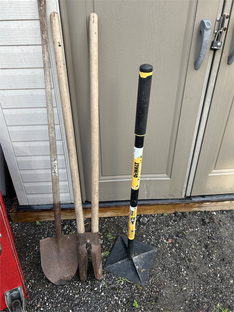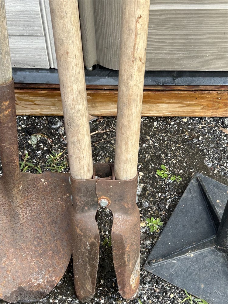 Three different style yard tools shovel tamper post hole digger