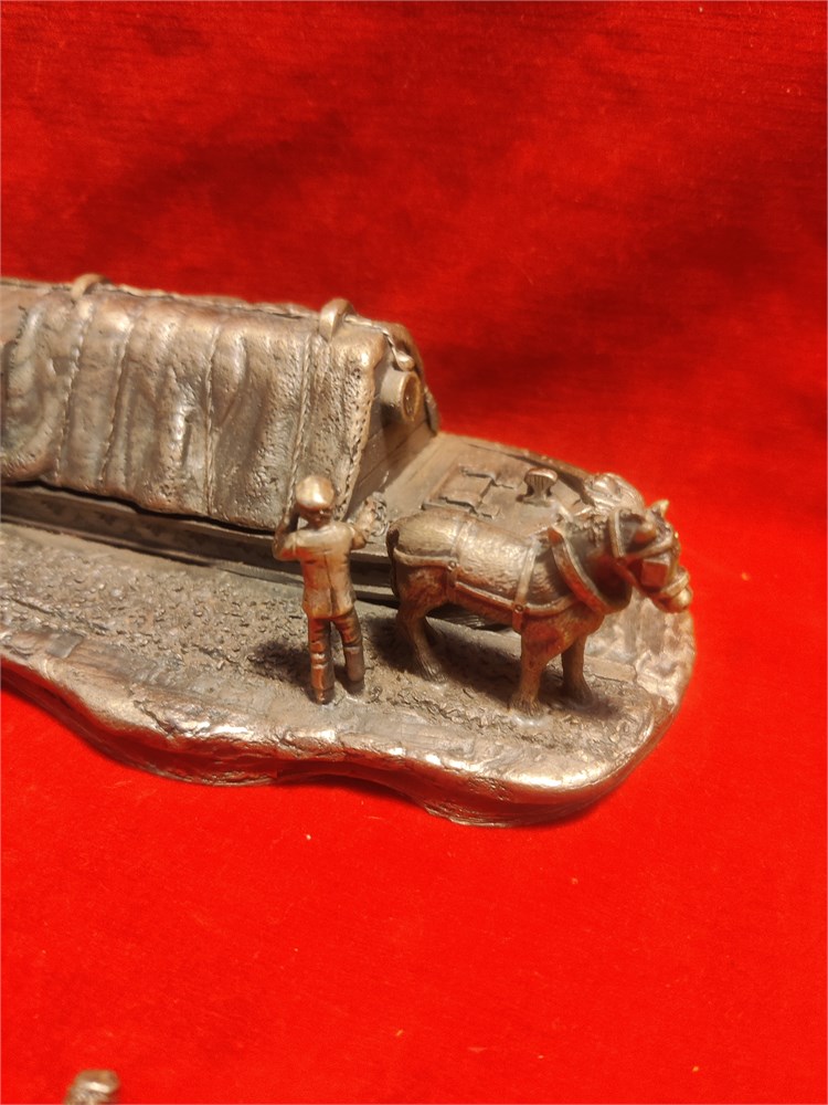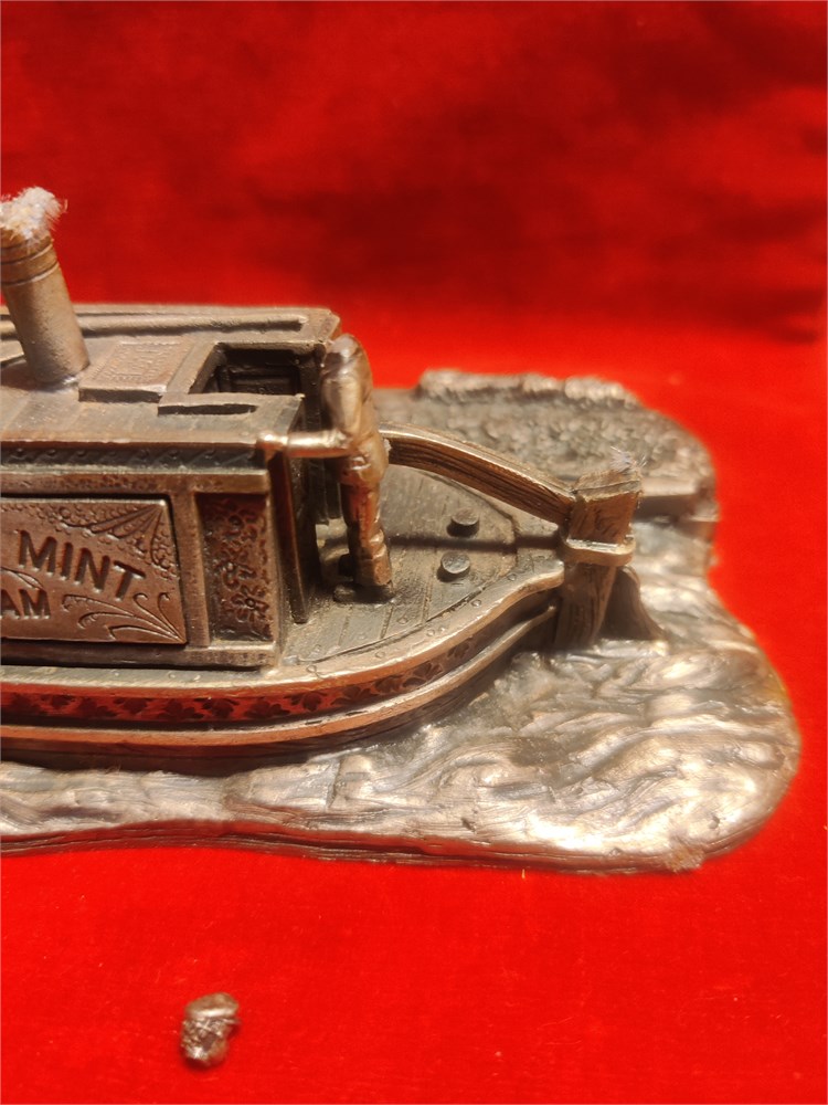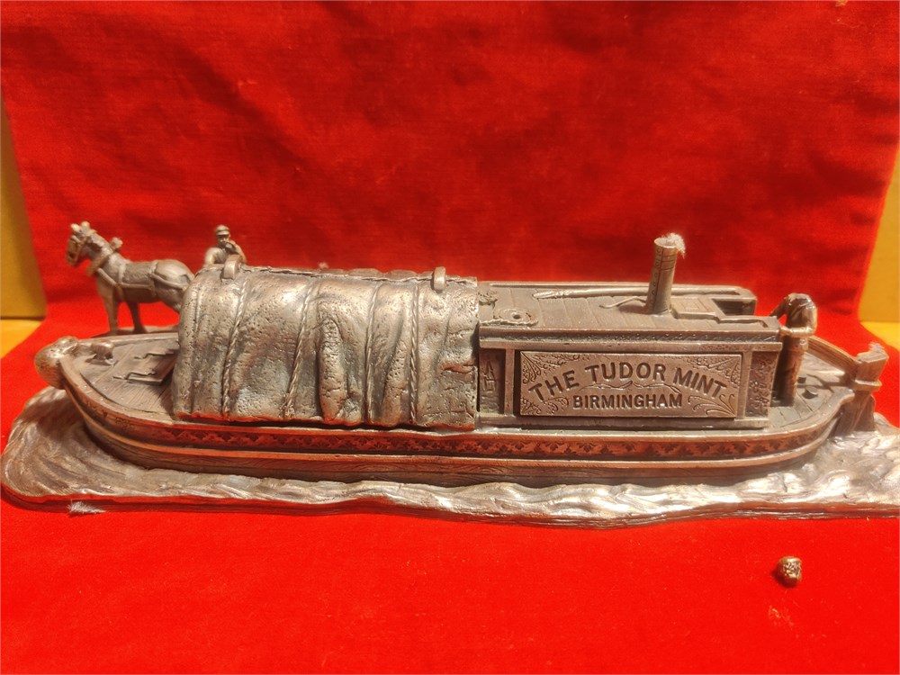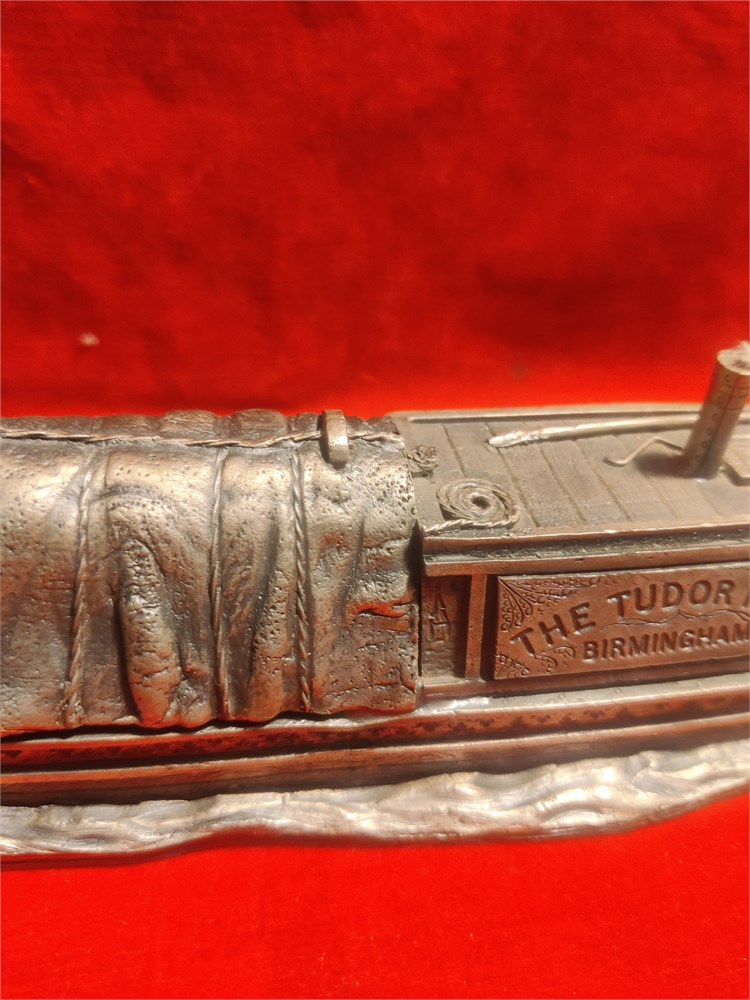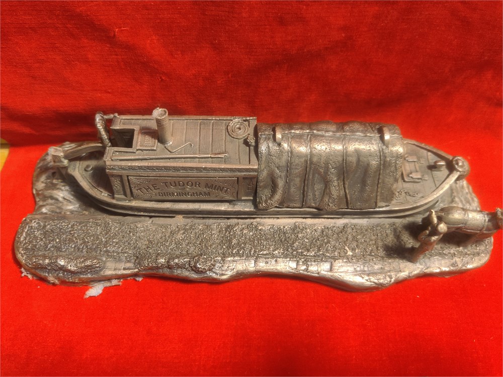 Nice piece of pewter featuring a river scene. Peace is titled the Tudor Mint Birmingham. Item measures about 12 in long 4 in wide 3 in tall. The figure on the boat's head has come off and is in need of repair. The head is included.