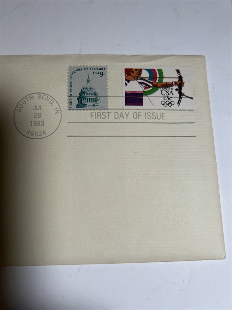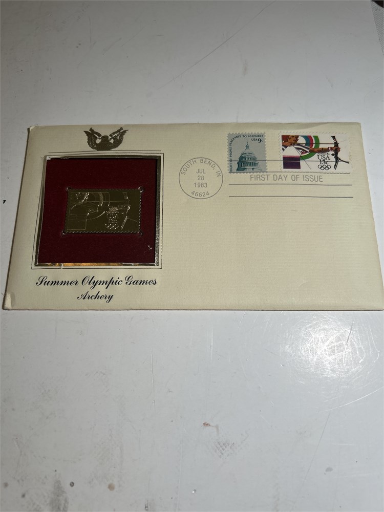 Summer Olympics games and archery South Bend, Indiana 1983 gold stamp still in the original packaging on opened  with the original paperwork