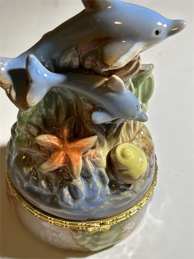 Dolphin Hinged Trinket Box With Three Dolphins Coral Seaweed NO TRINKET (LS)