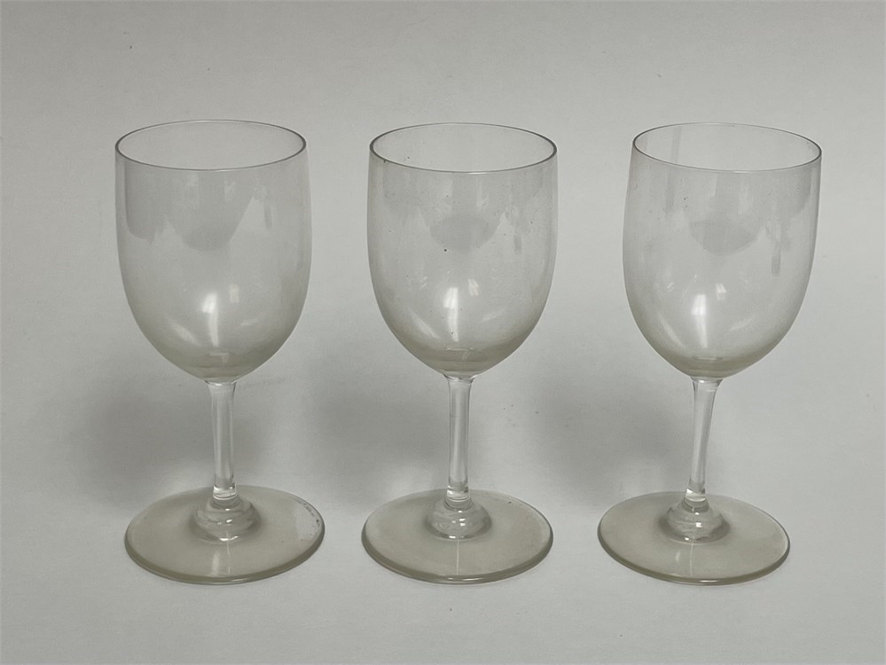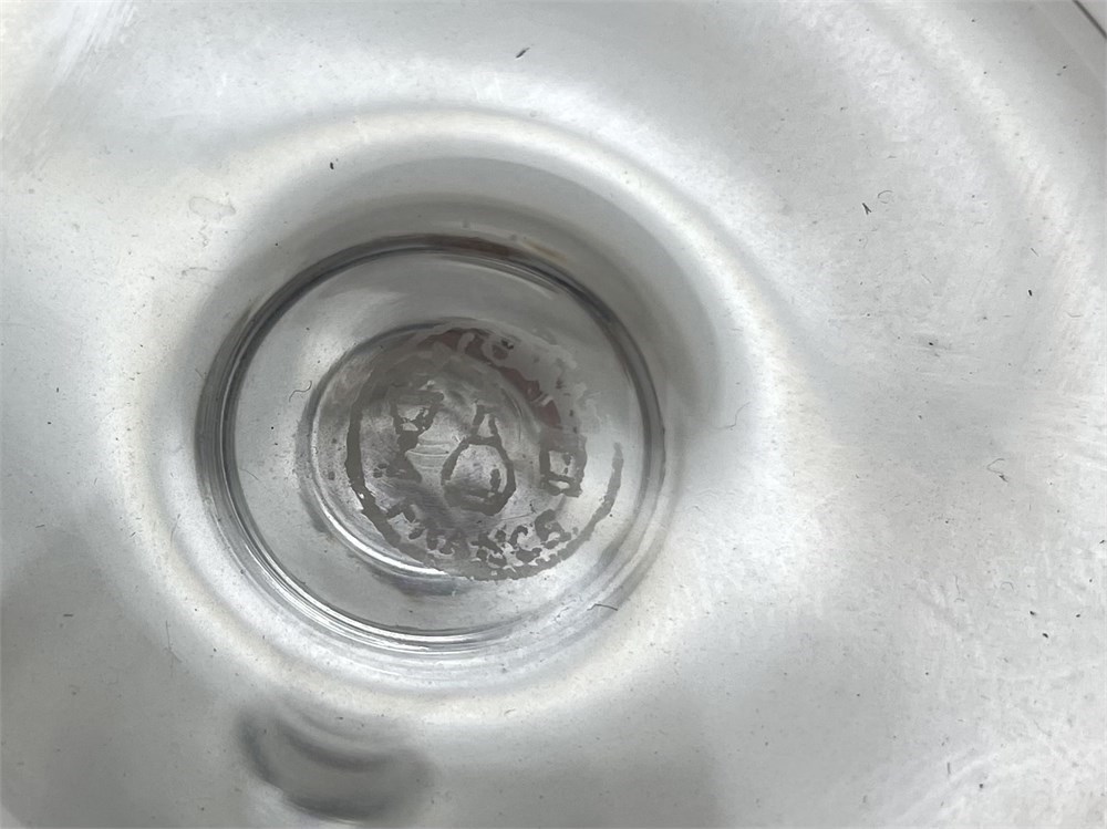 3 delicate crystal wine goblets in Montaigne pattern by Baccarat, etched on the bottoms with Baccarat, France, logo.  They are about 5" tall (almost 5 1/8"), good condition, no chips or cracks on any, but they do need a sudsy bath.
