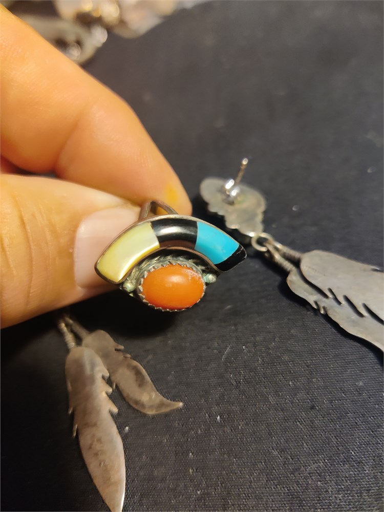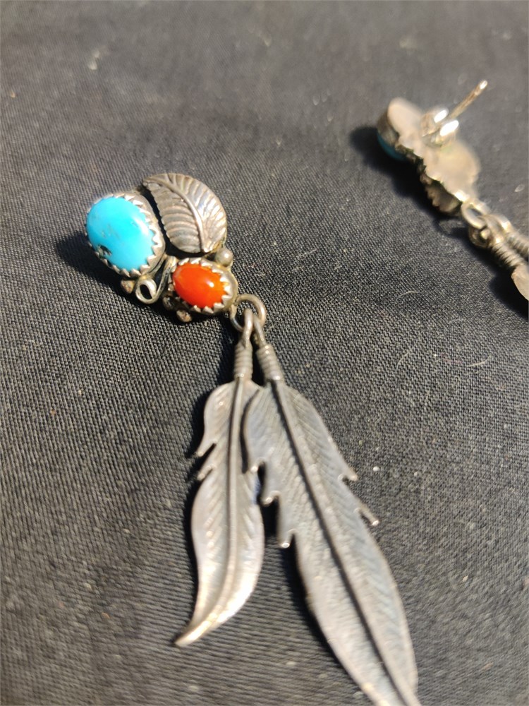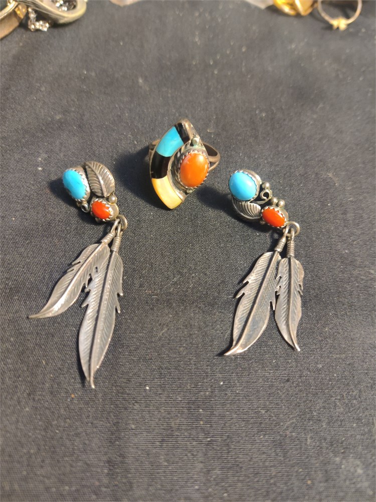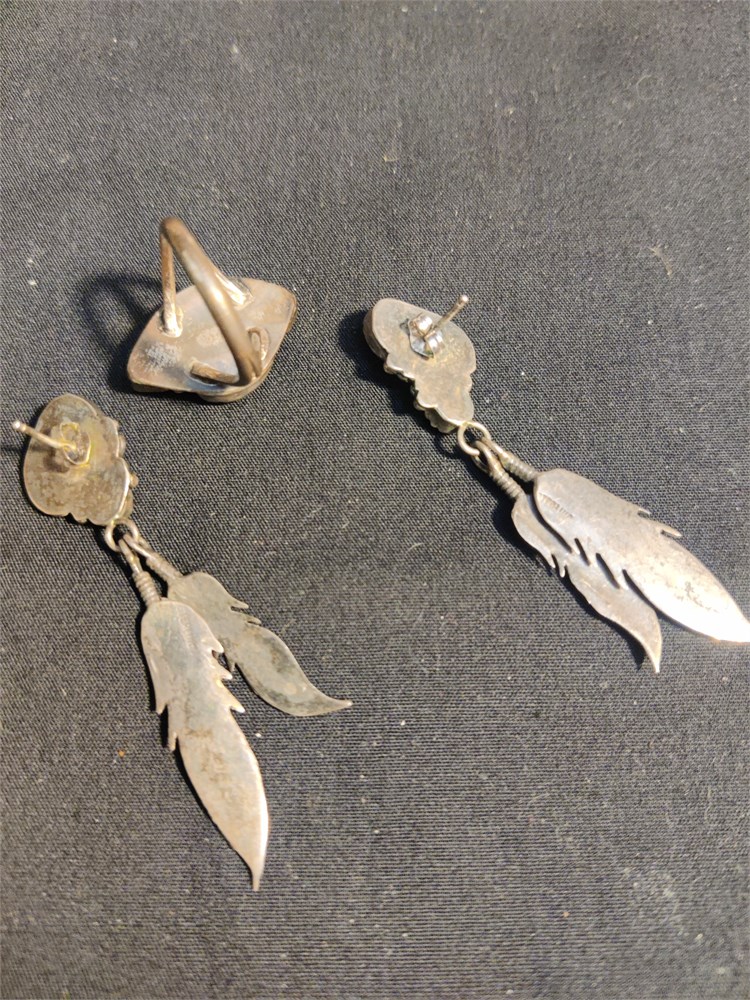 Very nice vintage native American turquoise feather earrings and matching ring. All pieces are sterling silver and have a total weight of 13.g