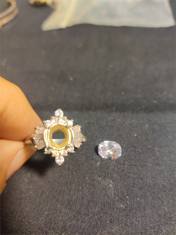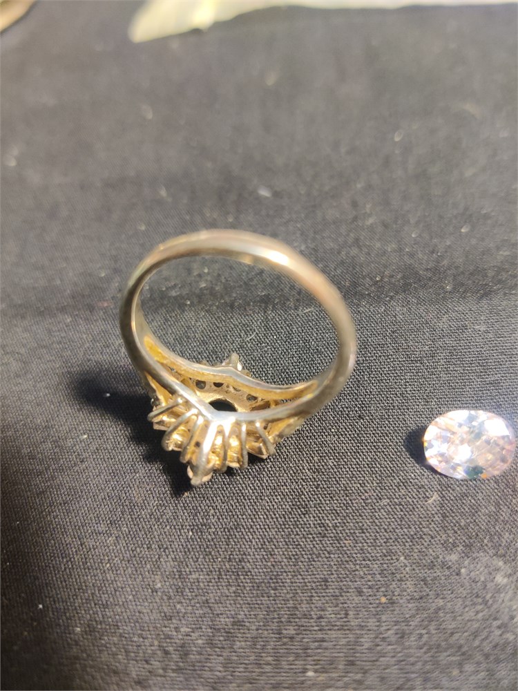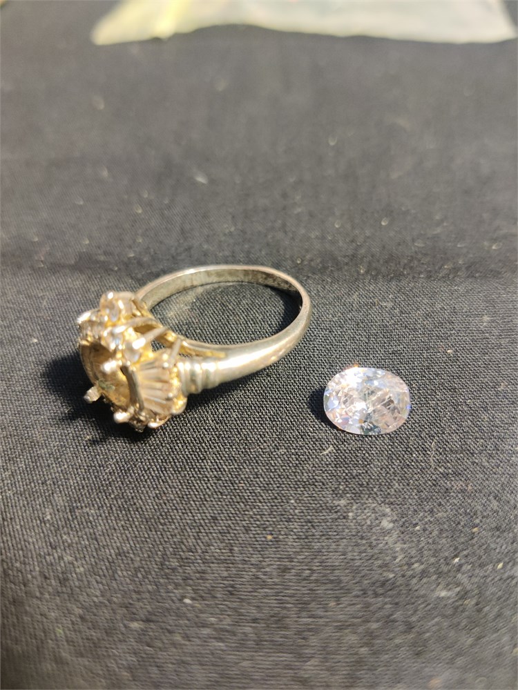 Very nice sterling silver ring with bag ass and roundstone surrounding large oval CZ stone stone has come loose from the ring and needs reset. Total weight of ring is 5 g without the stone.