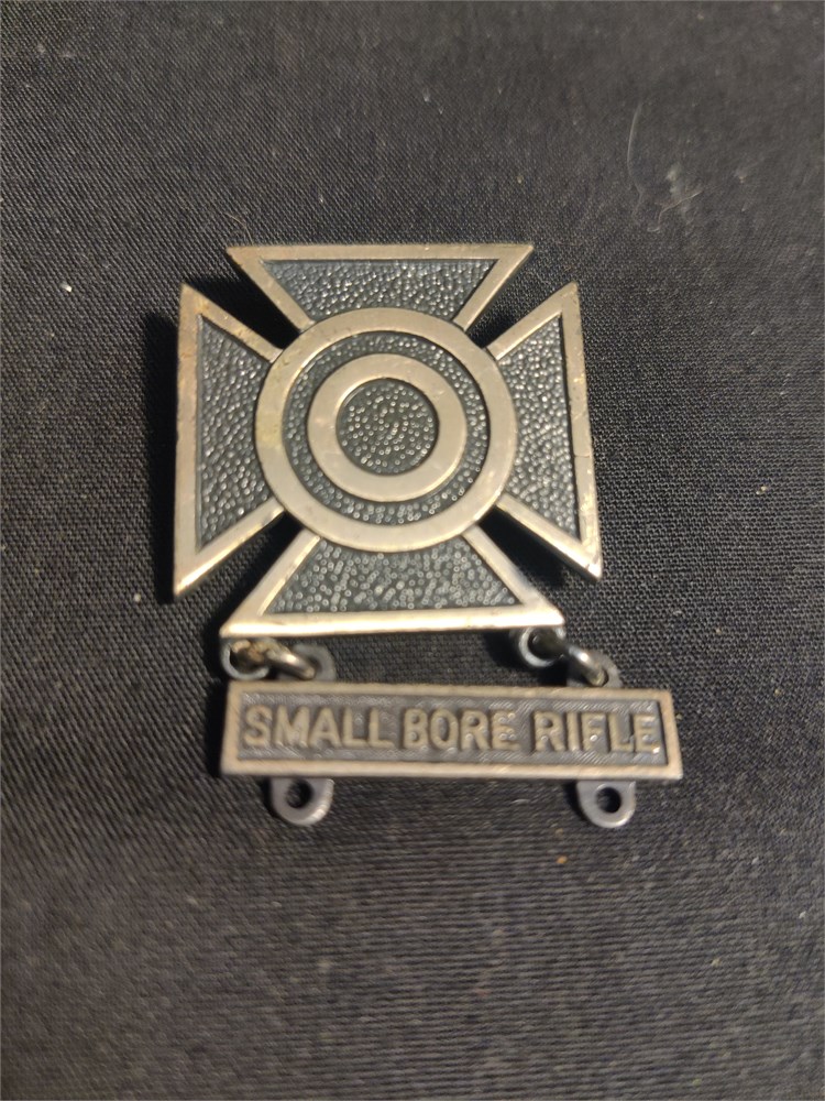 Vintage US Military Small Bore Rifle Marksmanship Qualifacation Badge Pin Back. Pin is Sterling Silver and weighs 10.4g.