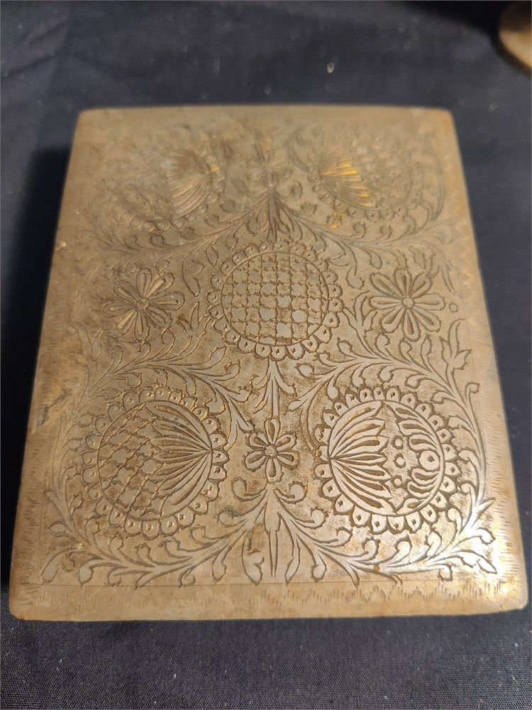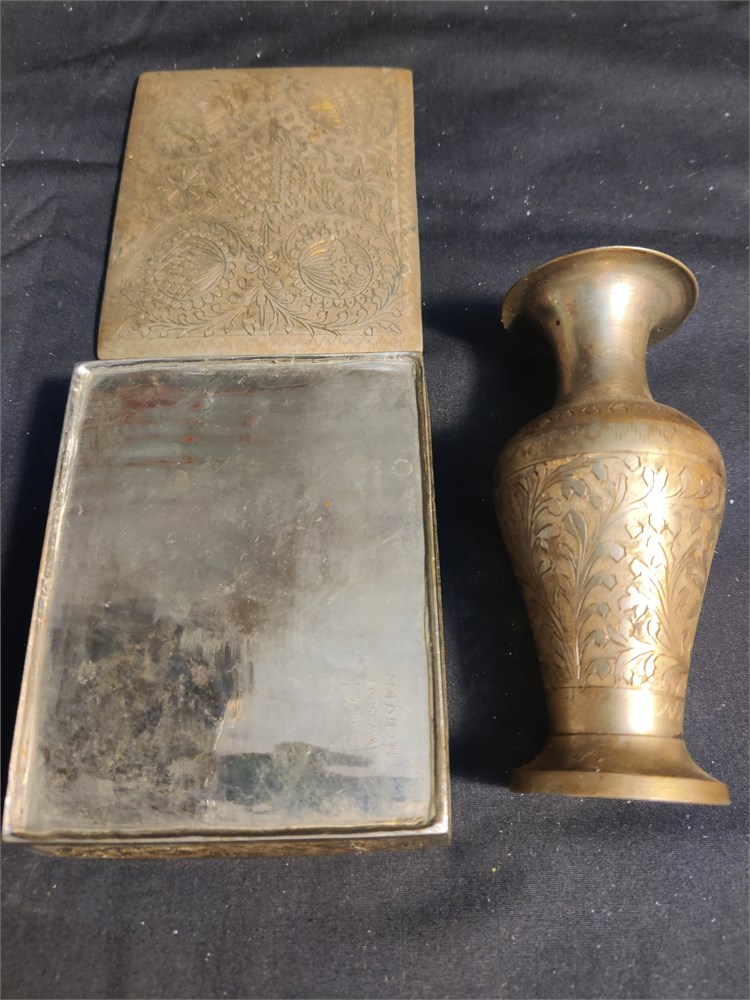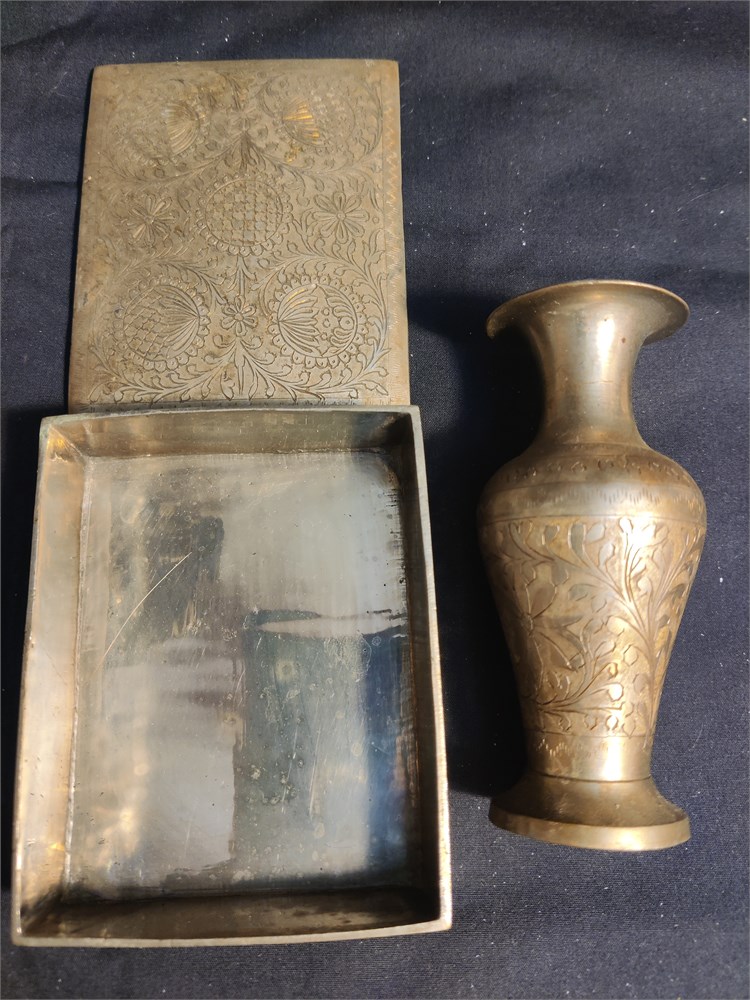 Vintage brass trinket box and small vase trinket box is 3 and 1/2 in wide 4 in long and 1 in deep vase stands just over 4 in tall. Both pieces are marked as made in India.