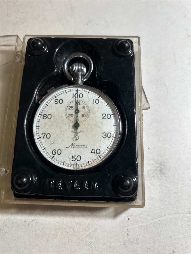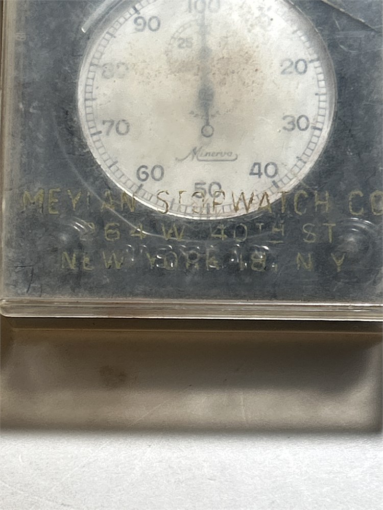 VINTAGE MINERVA SWISS MADE SILVER TONE WIND UP STOPWATCH. In the original case