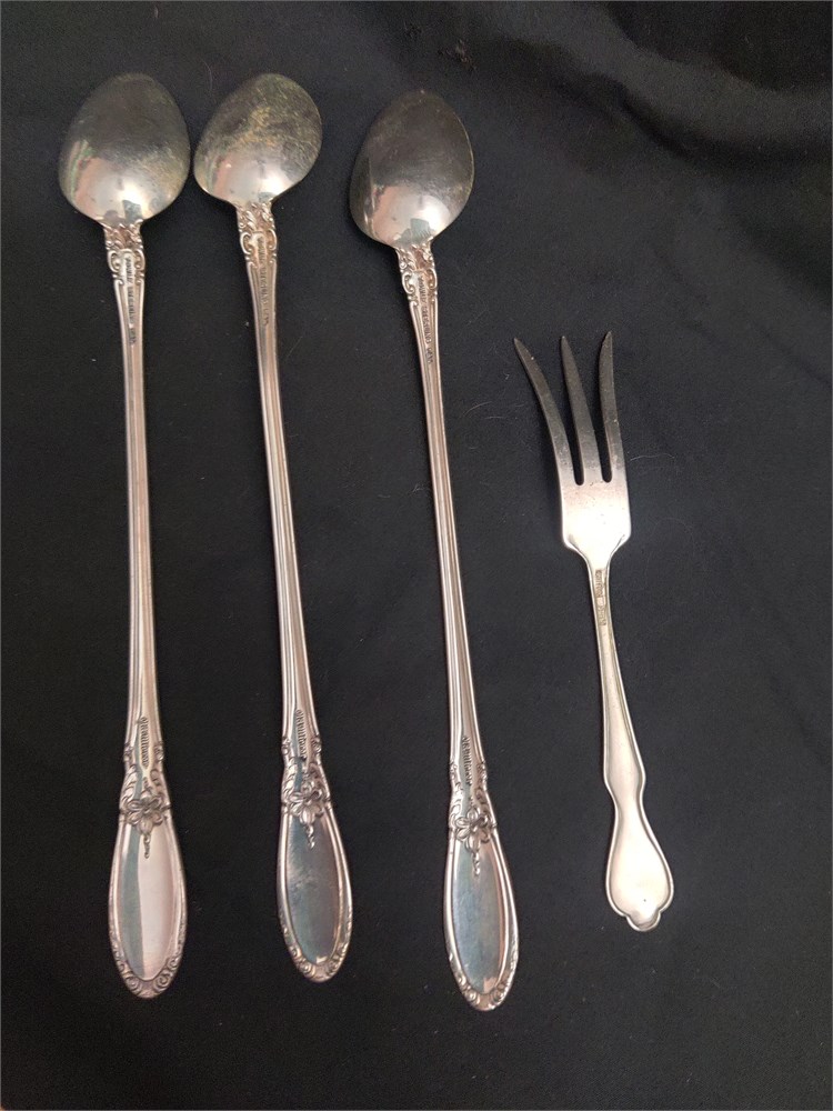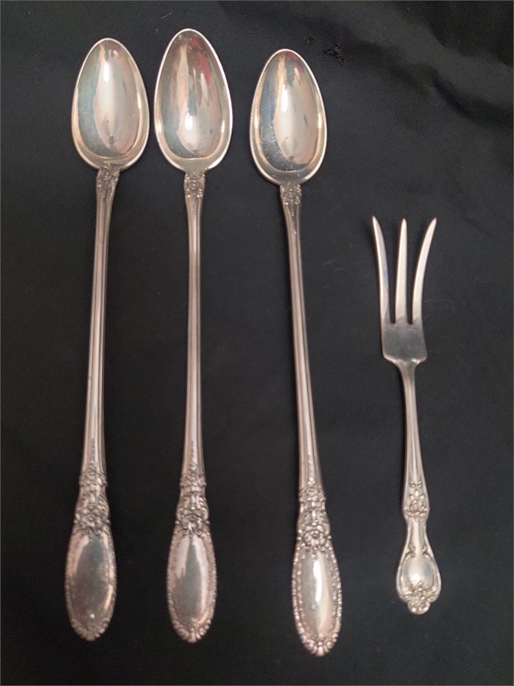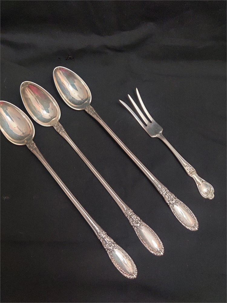 Lot of three sterling silver teaspoons and one lemon fork. Total weight of all four is 105.6 g. All are Marked Sterling on the back.