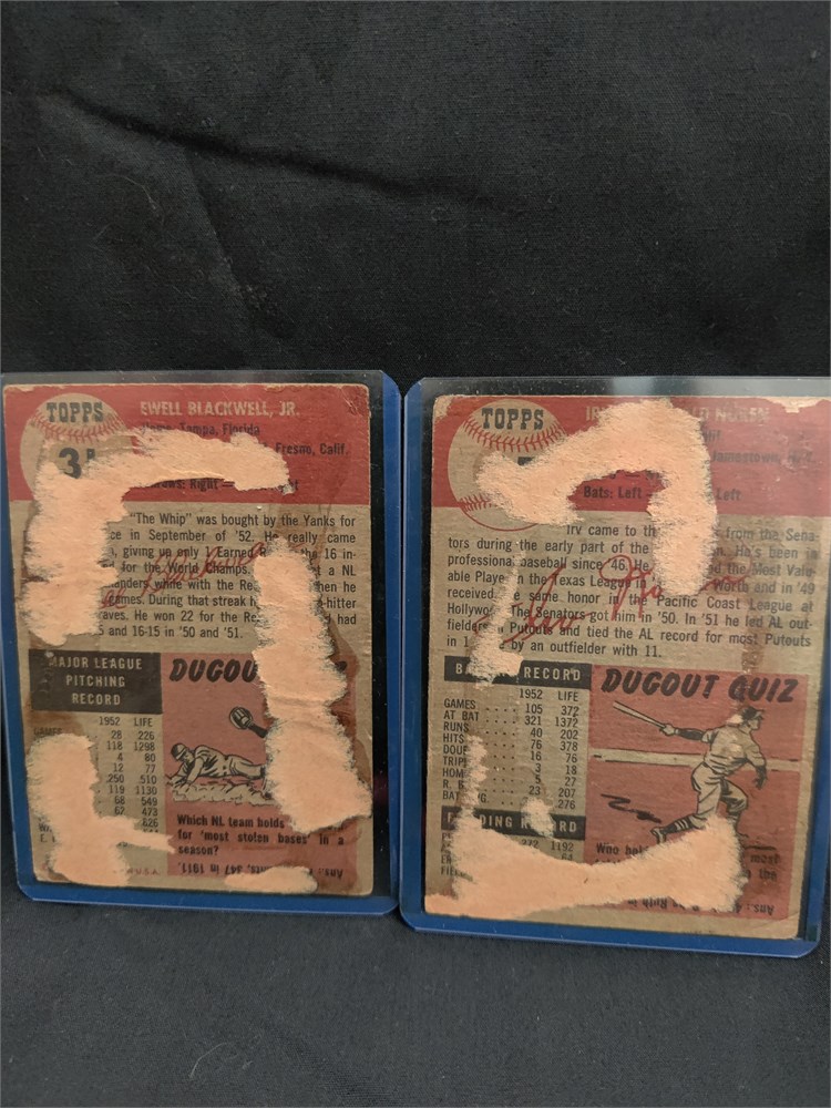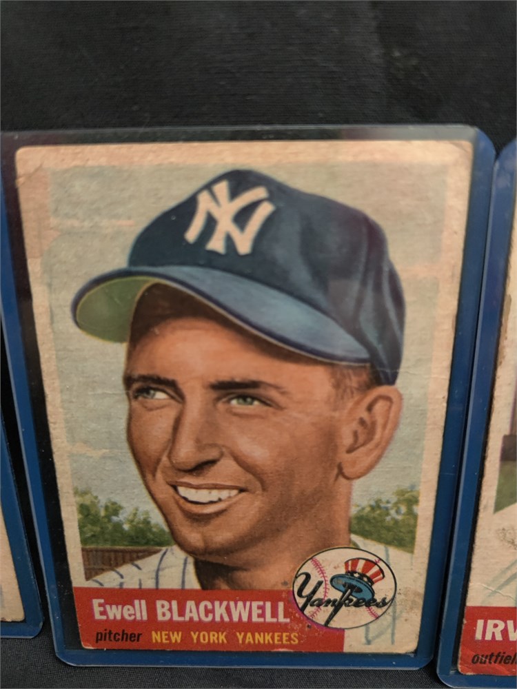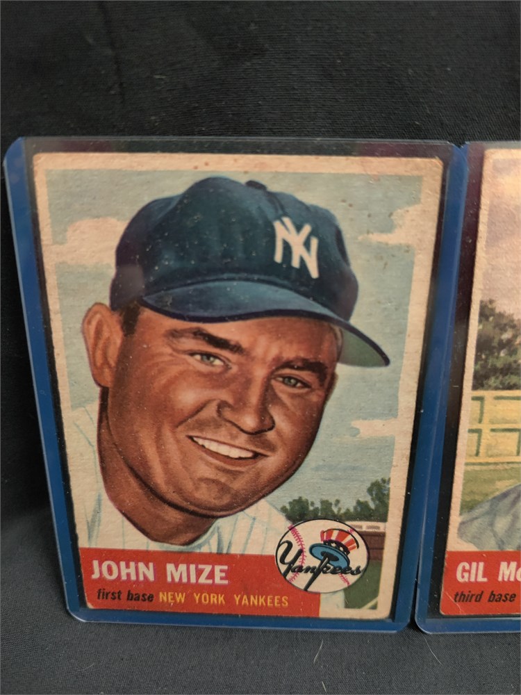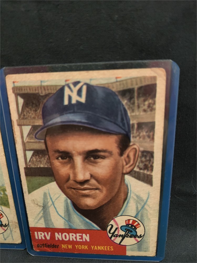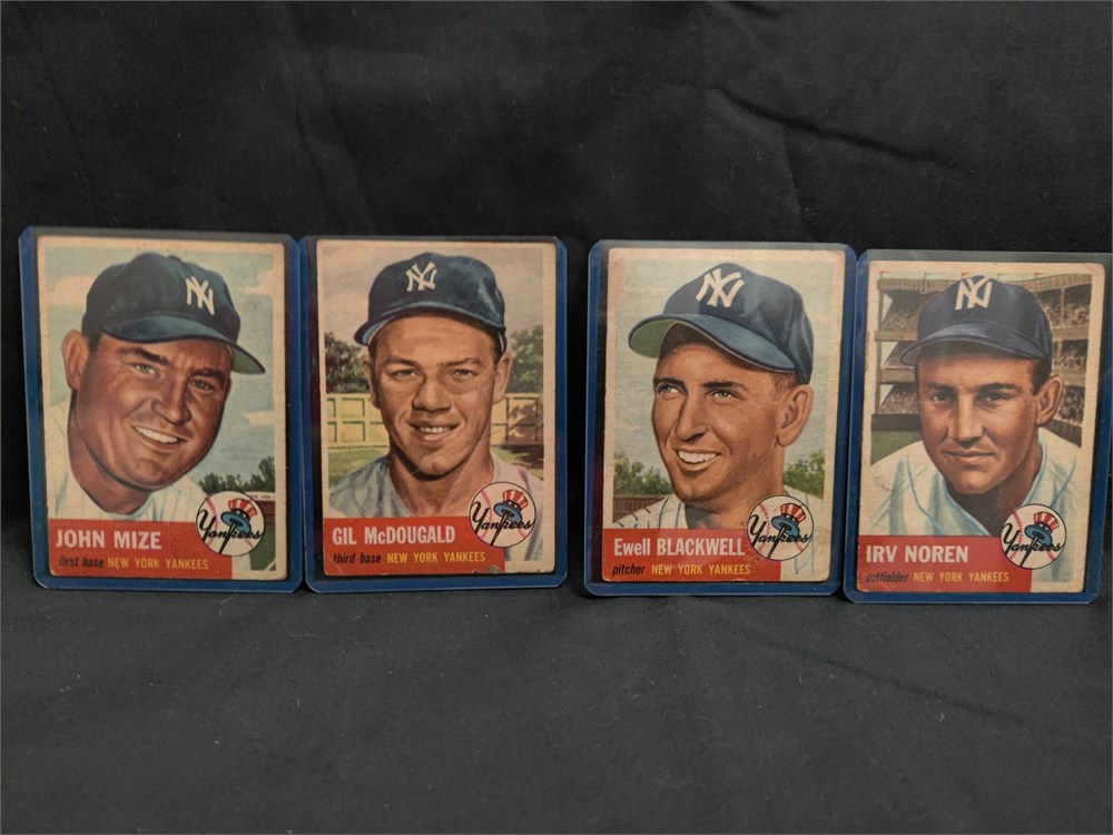 Lot of four 1953 Topps baseball cards. All cards feature in New York Yankees. Includes Hall of famer Johnny mize. The fronts of the cards are in nice condition. Unfortunately these cards were in an album and there is paper loss on the back of all four cards.