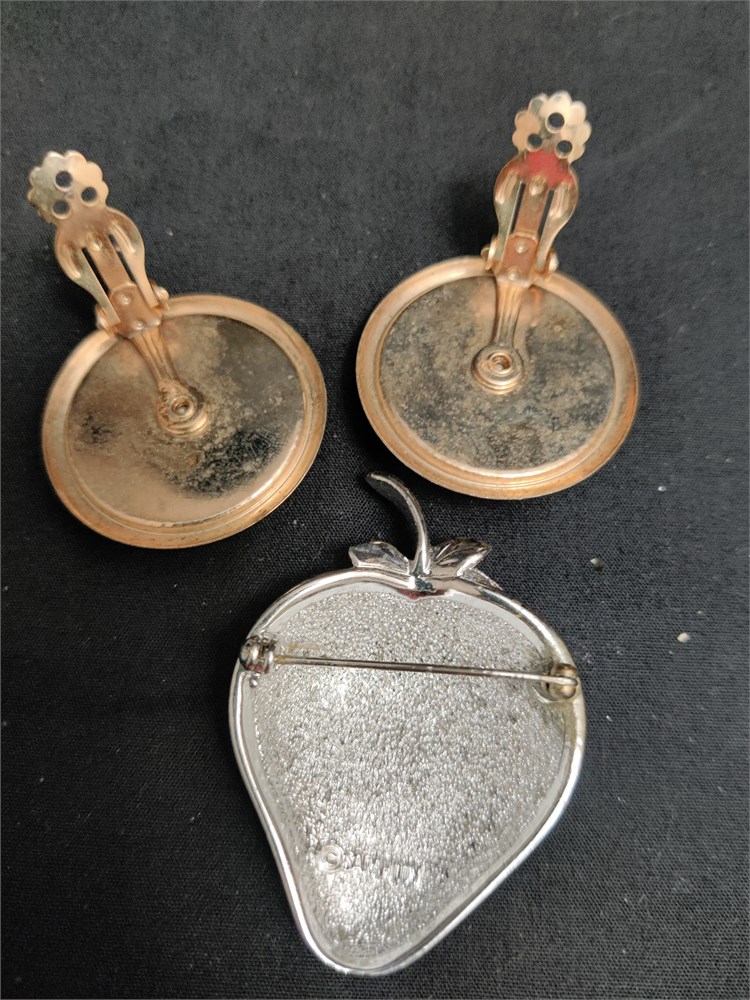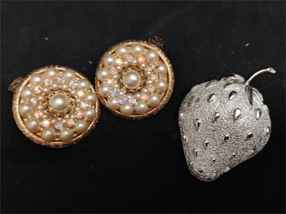 Vintage Faux Pearls Cluster Goldtone Clip-on Earrings and Sarah Coventry strawberry brooch.
