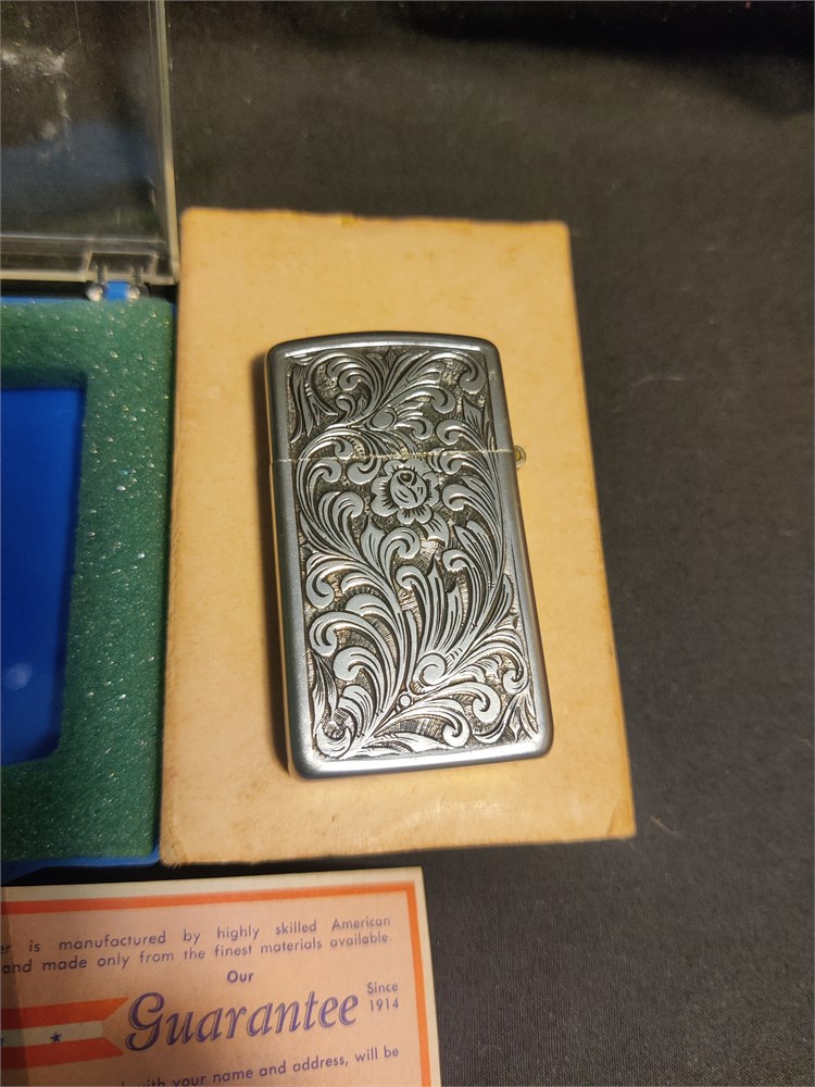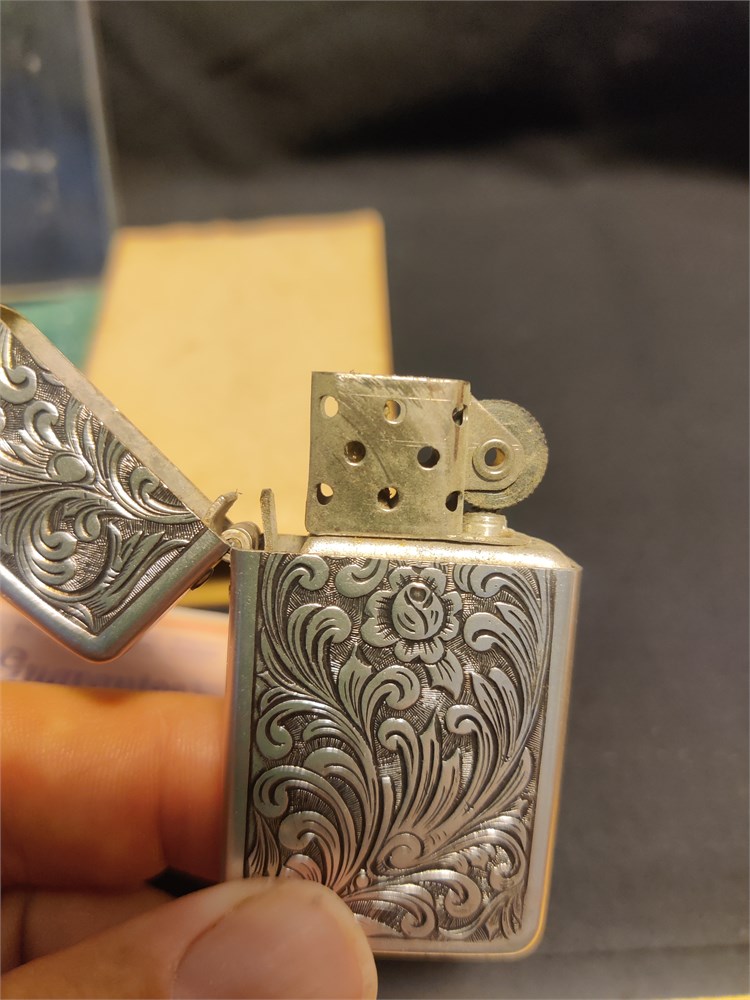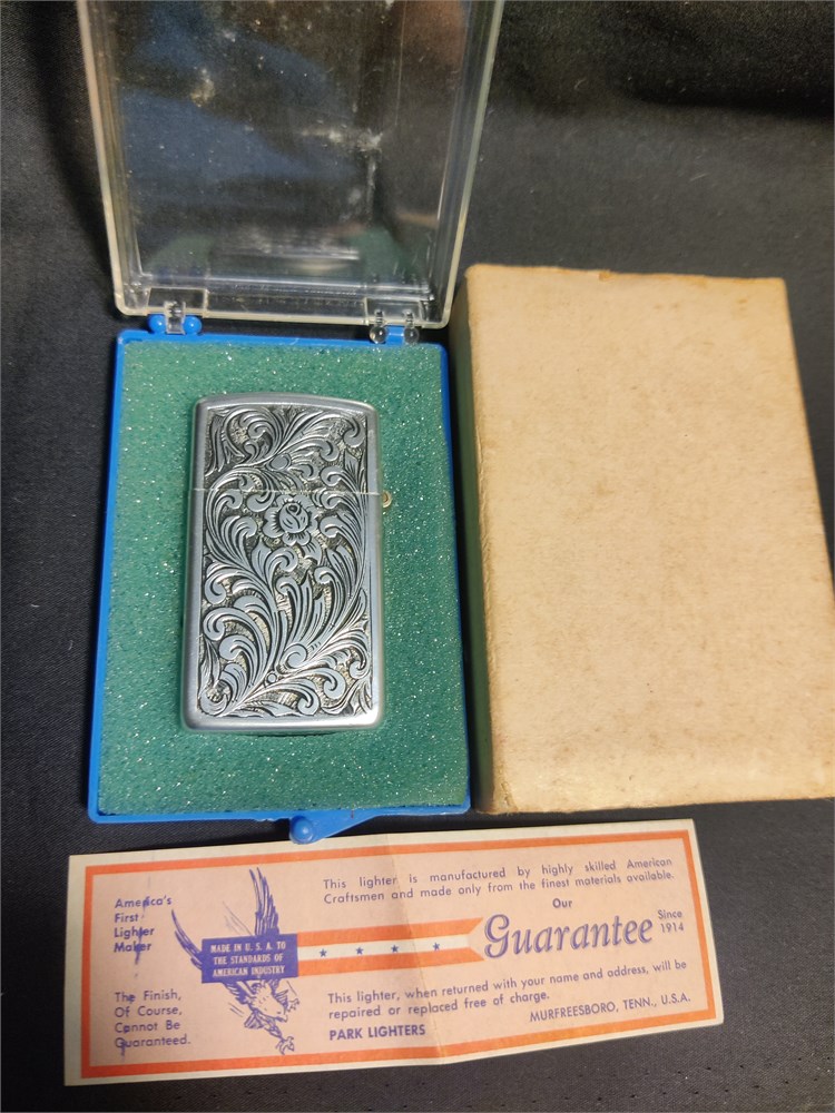Nice vintage etched park industries lighter. Comes in original box with the guarantee.