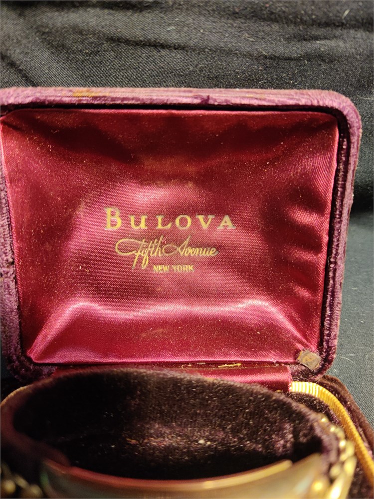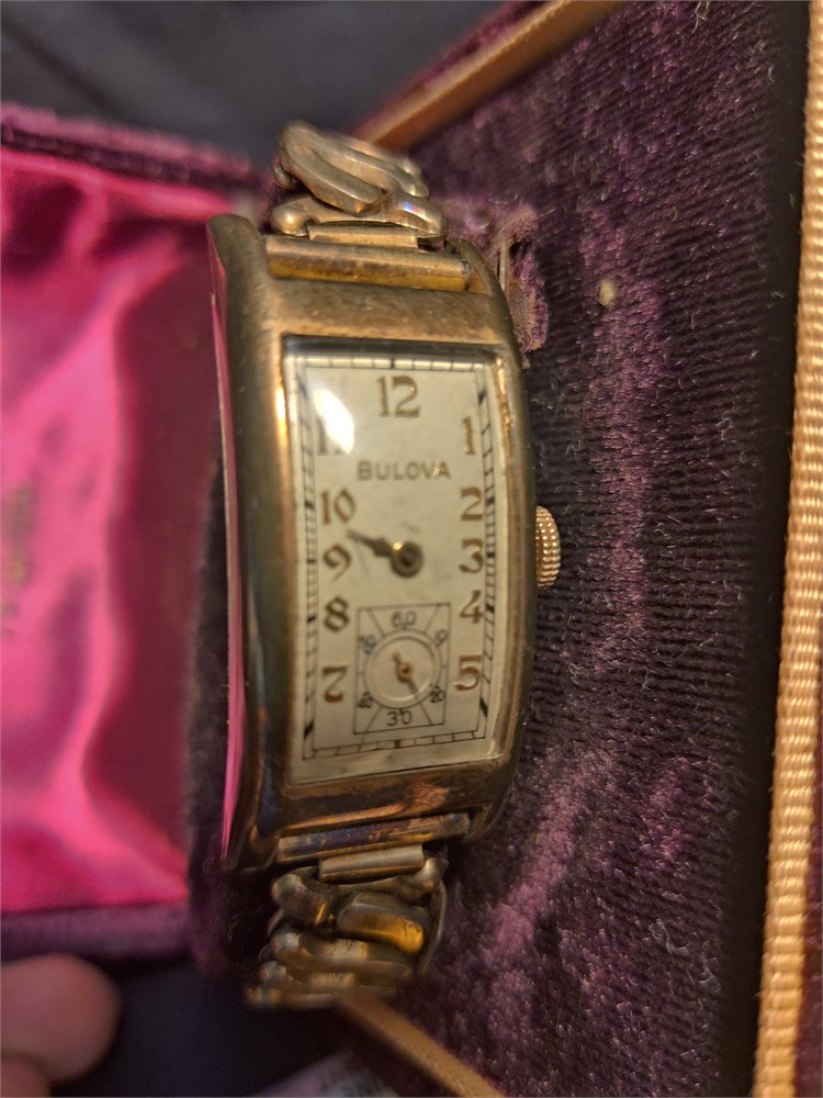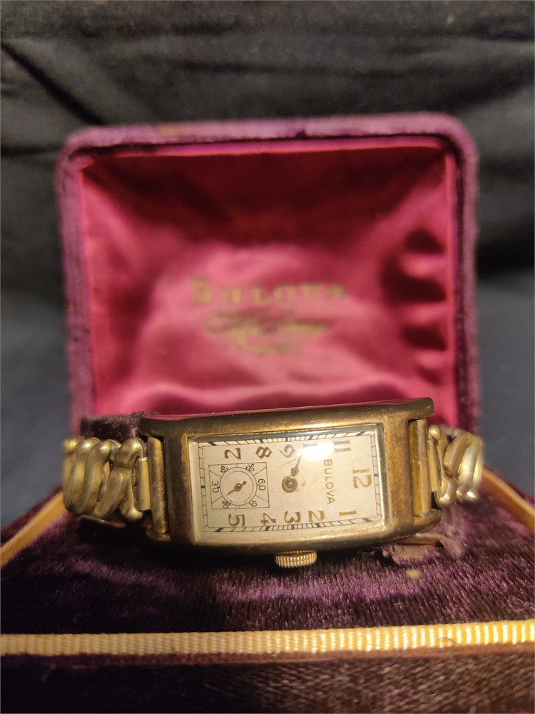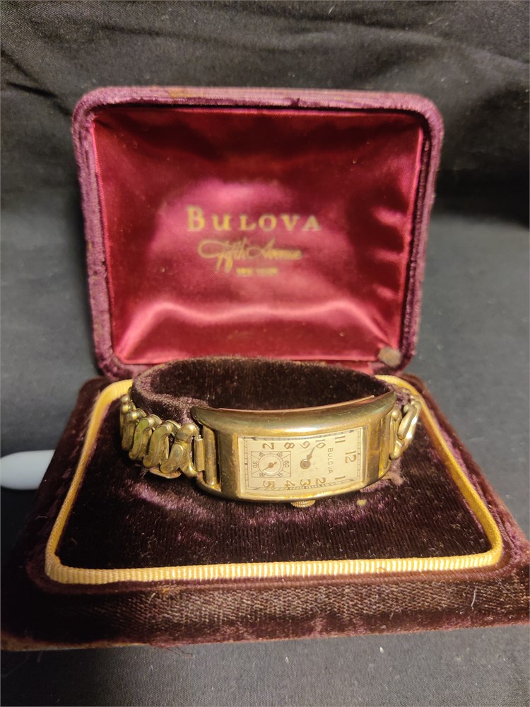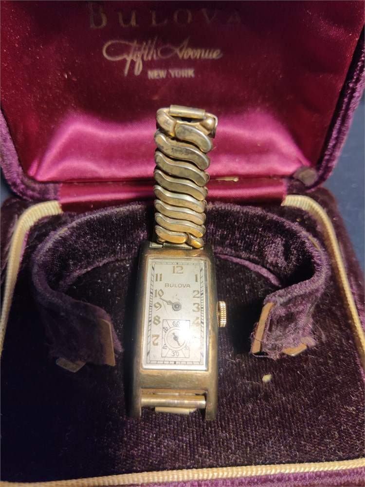 Bulova"Curvex"Gold Filled 10k, Rectangular Curved Watch 1930s Tank Art Deco Men. Comes with the original fifth avenue New York box. Watch is currently not working.