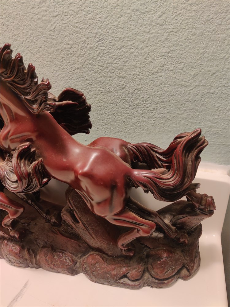 Vintage Chinese Red Cast Resin Carved Statue Figurine Galloping Horses. Sculpture measures 16 in long stands 11 in tall to the highest point.
