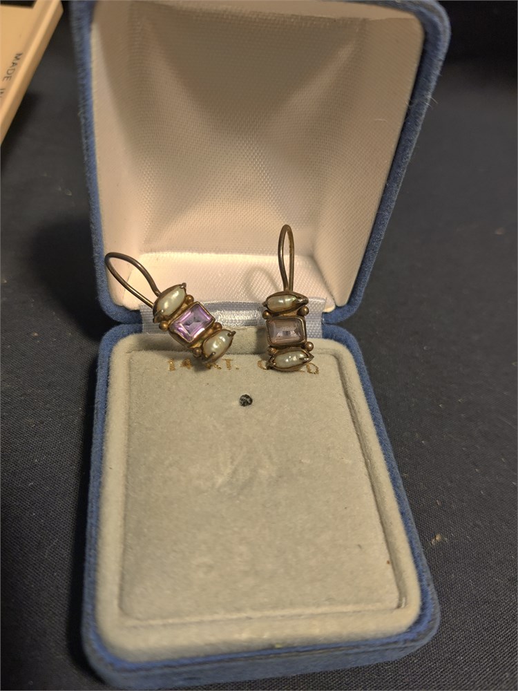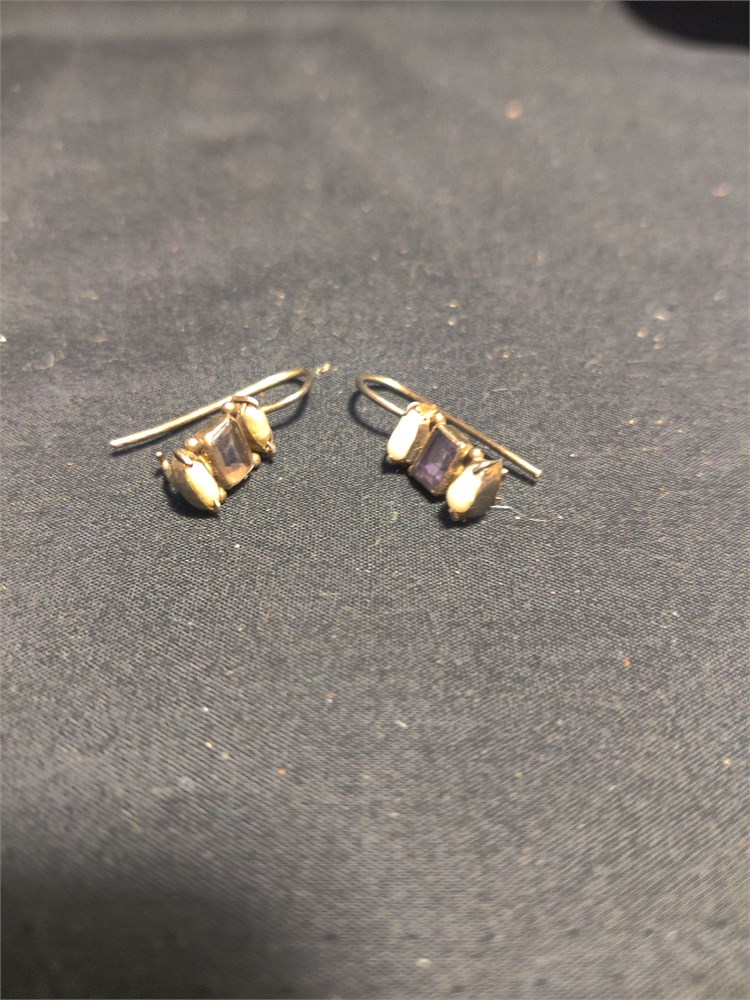 Vintage sterling silver earrings. Looks like they are fitted with amethyst colored stone and pearl-like settings. Total weight of both earrings is 2.8 g.