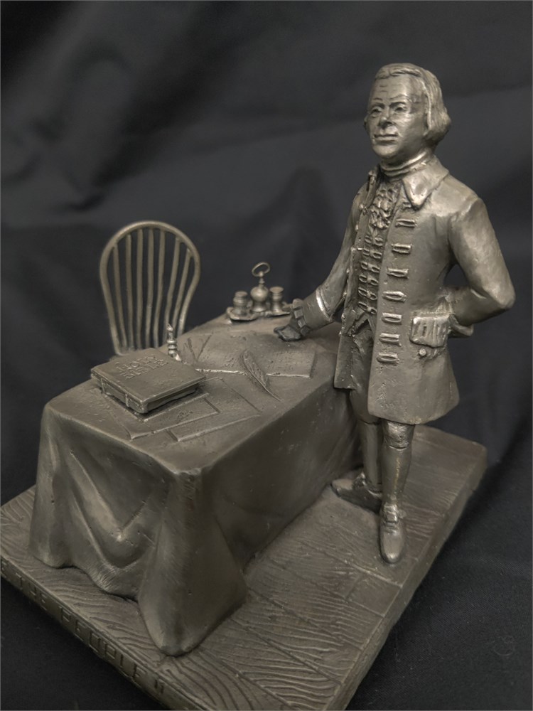 Declaration of Independence we the people pewter figure and desk. Figure is of Thomas Jefferson the drafter of the declaration of Independence. Figure is about 4 in wide 5 in deep and stands nearly 5 in tall. Very cool detail very nice display piece