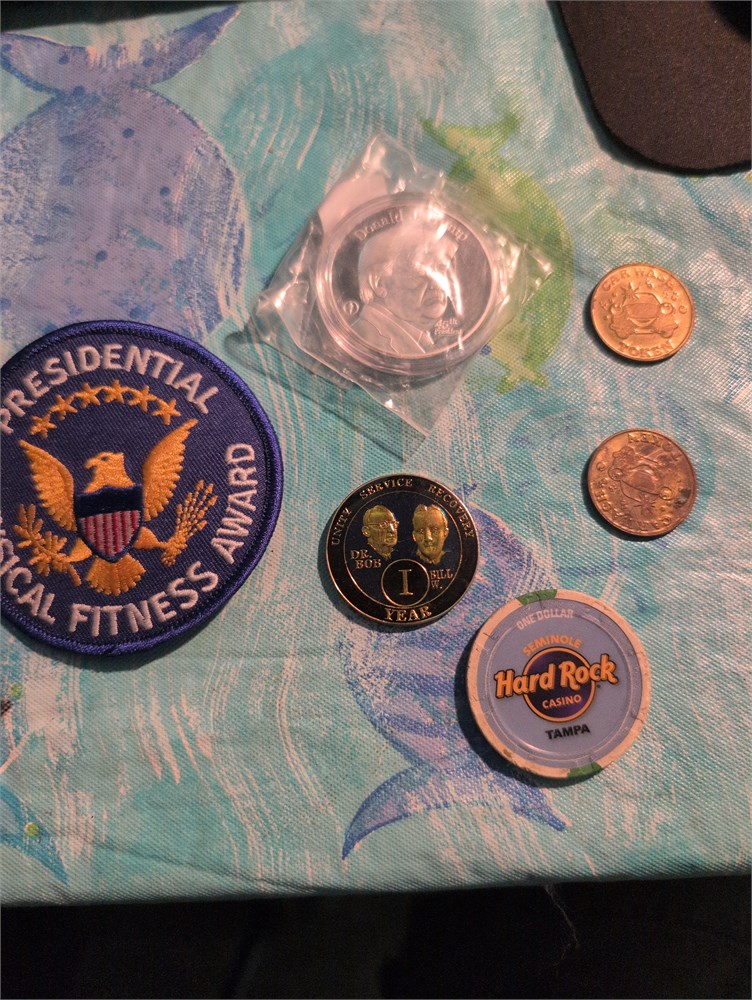 You get everything you see in the pictures. A vintage presidential fitness award patch two tokens, a gaming chip from the hard Rock casino and the brand new in the package. Trump silver tone commemorative presidential coin