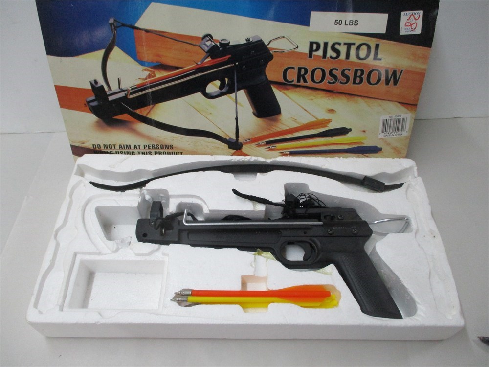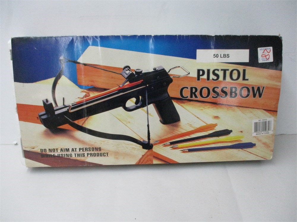 A vintage Pistol Crossbow with 4 darts.   No target.  It is in good used vintage condition.