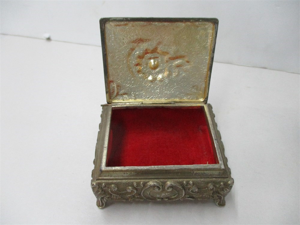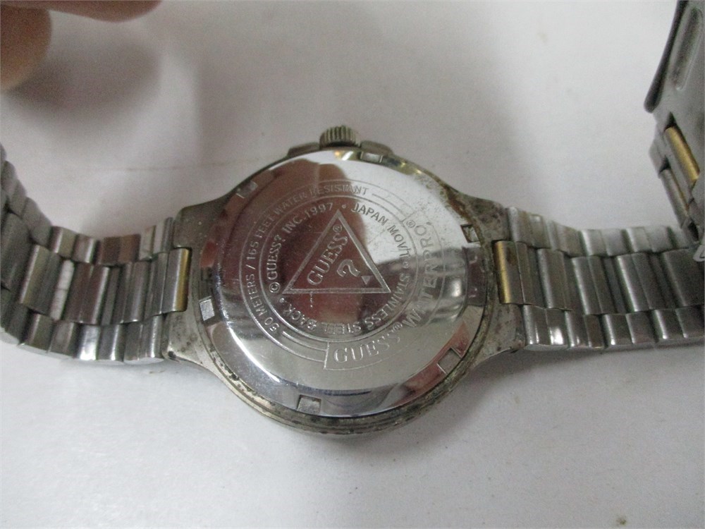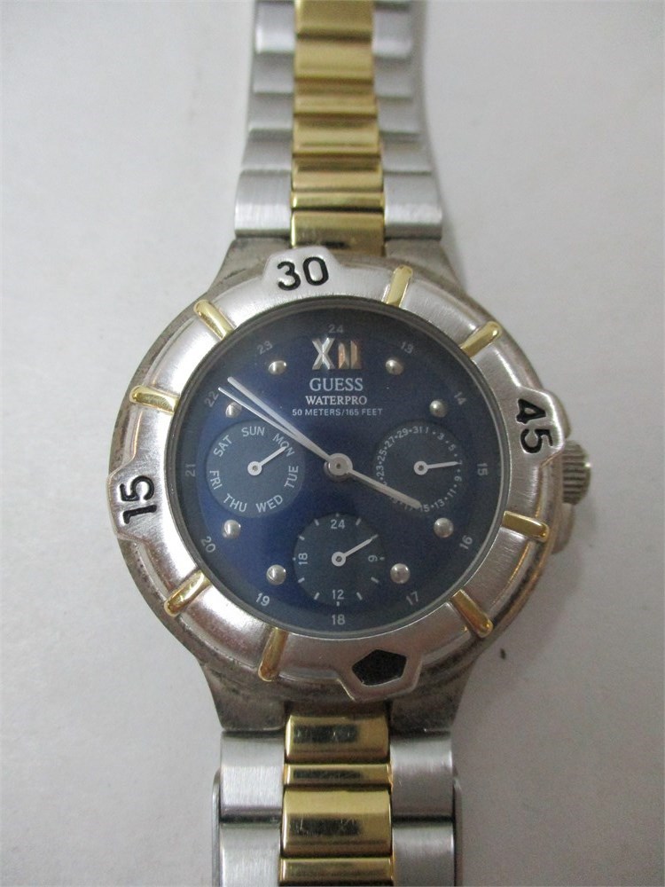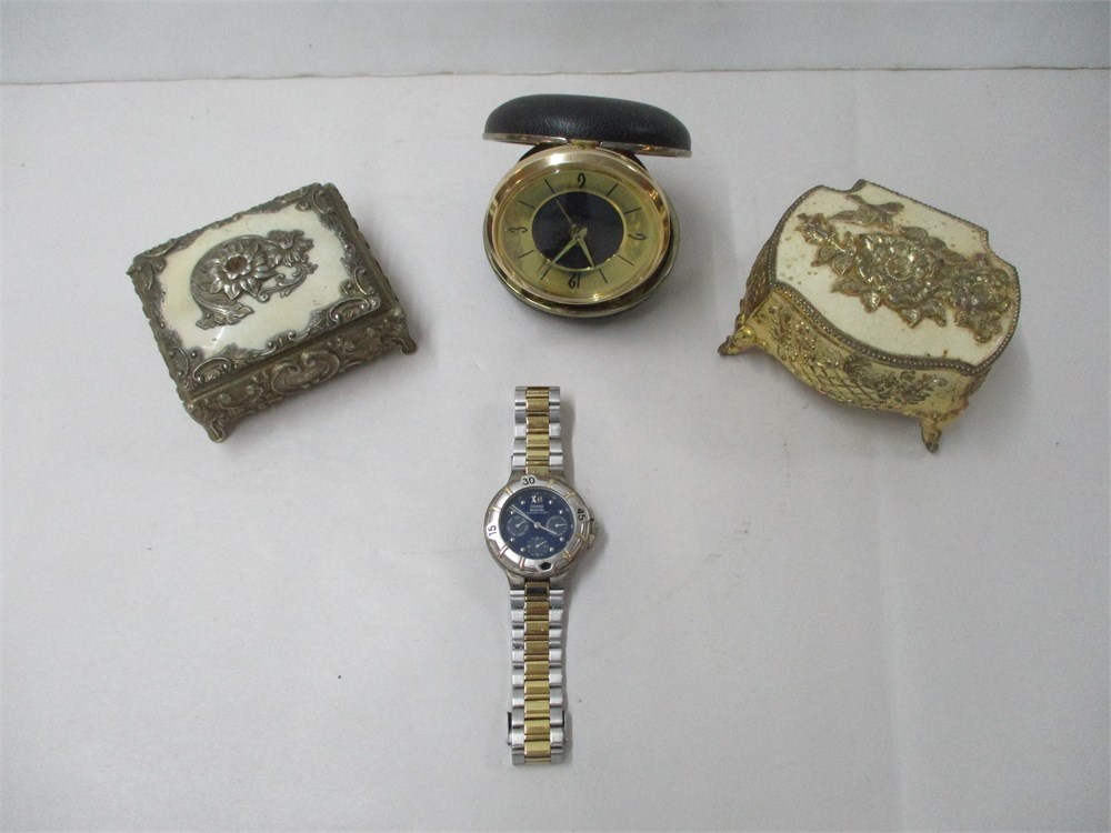 This 5 piece lot consists of 2 mixed metal trinket boxes both lined, a folding travel bedside clock and a Guess Watch.  The trinket boxes are fair to good condition, with some staining to the enamel and wear to the gilt. The folding travel clock is in good condition and working at time of sale.  The Guess watch has a nice blue face, when the stem pulls out the hands move but it might need a battery.  No guarantees of working condition.