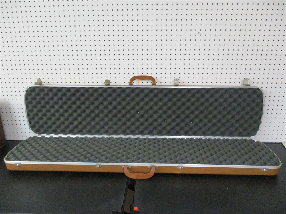 This tan Gun Guard hard side gun case in good used condition.  Scuffs, some rust on latches.  measures 52" x 12".