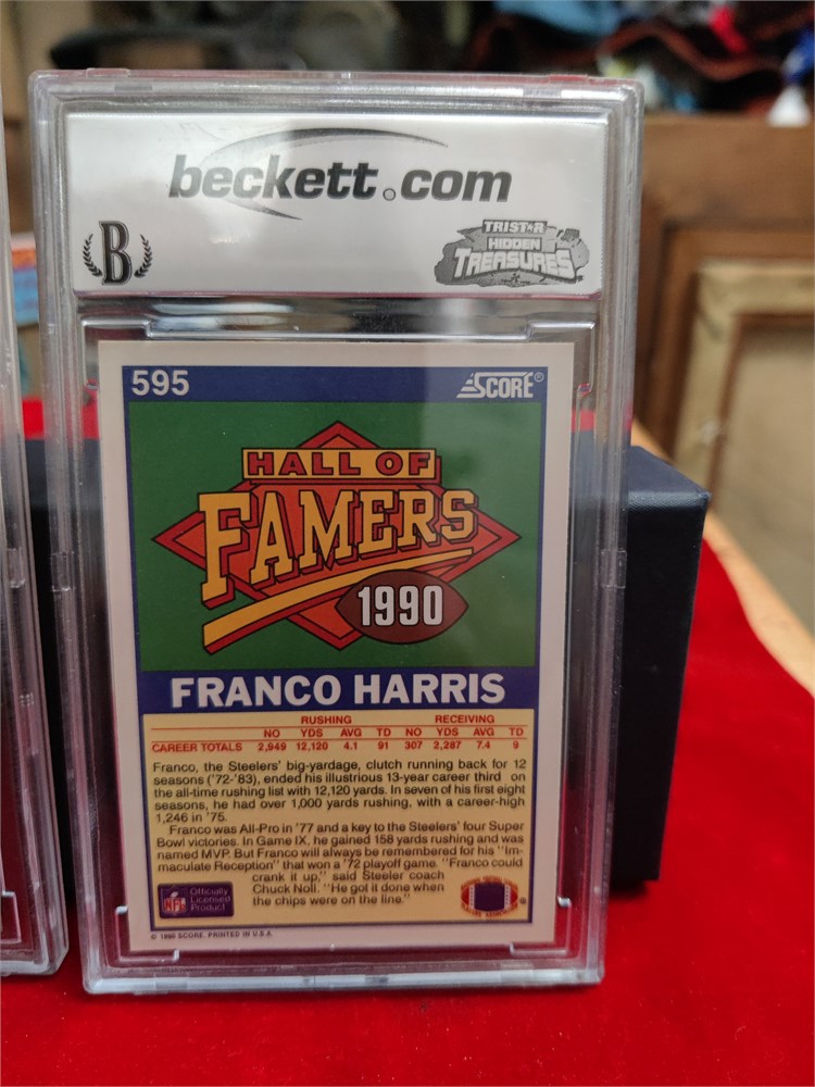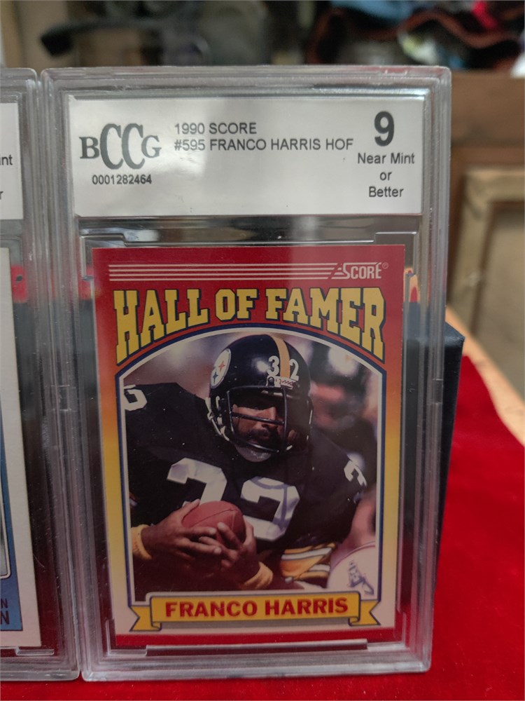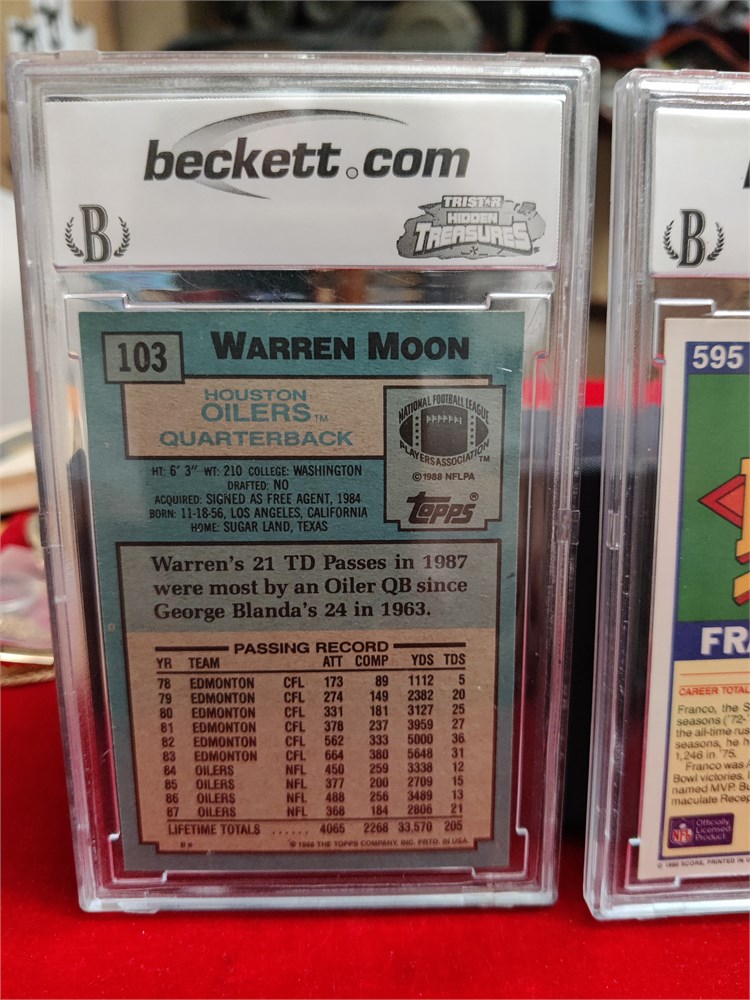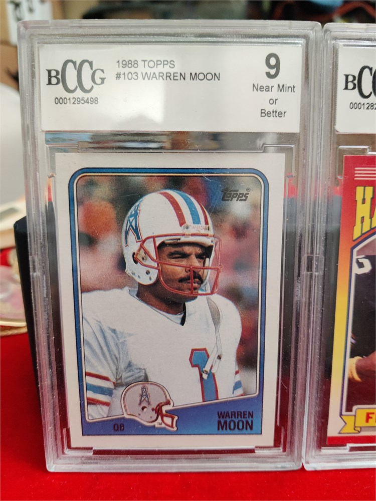 Two grated football cards both cards are graded by Beckett card grading. One is a 1990 score Franco Harris near Mint 9 the other is a 1988 Topps Warren Moon graded a 9.