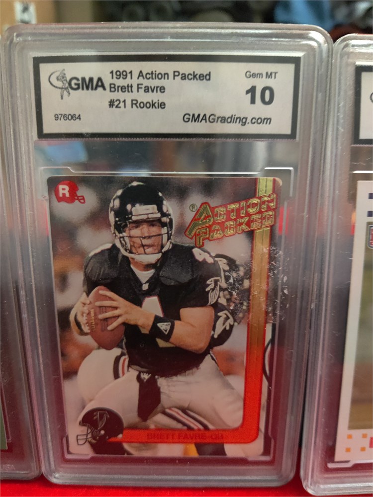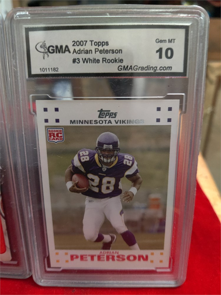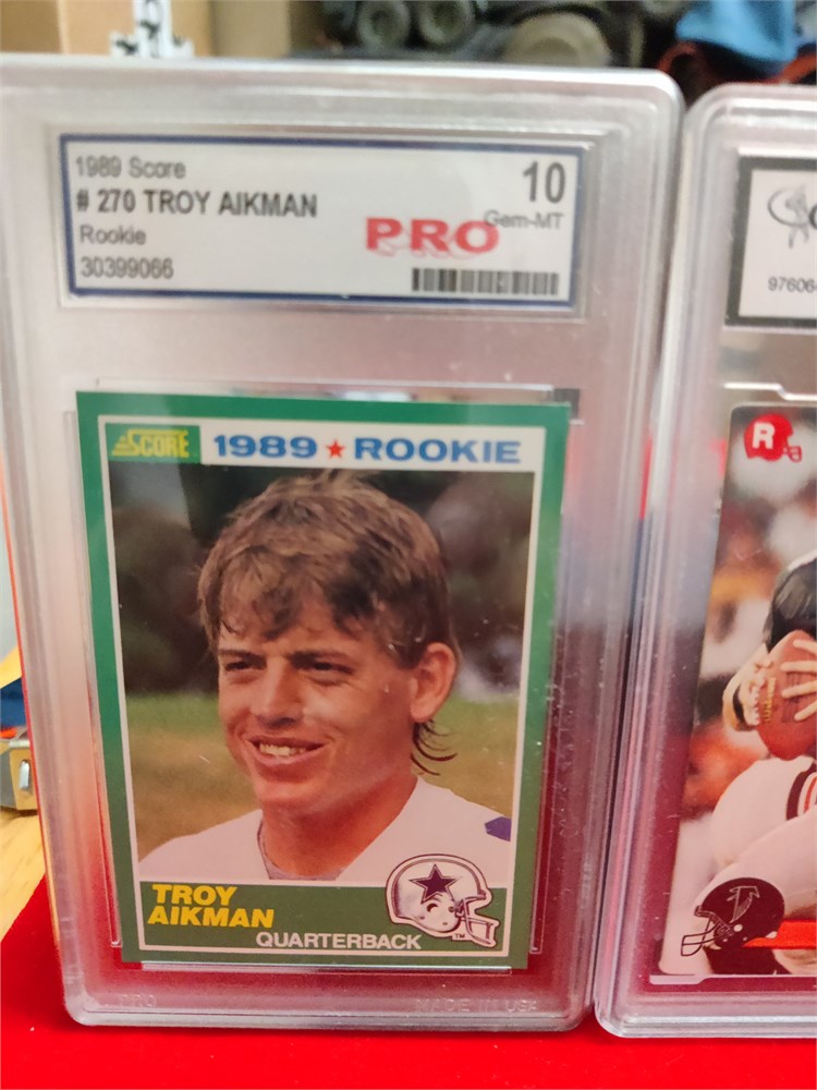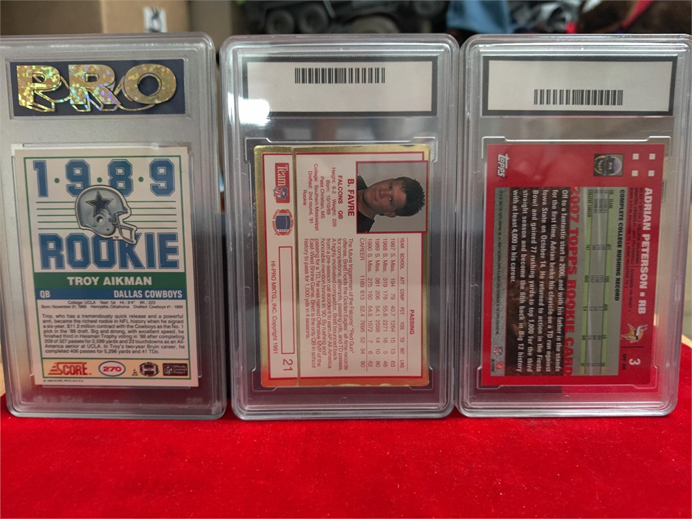 Lot of three graded football cards. Includes an '89 score Troy aikman, 1991 action packed Brett favre and 2007 Topps Adrian Peterson. All three are rookie cards.