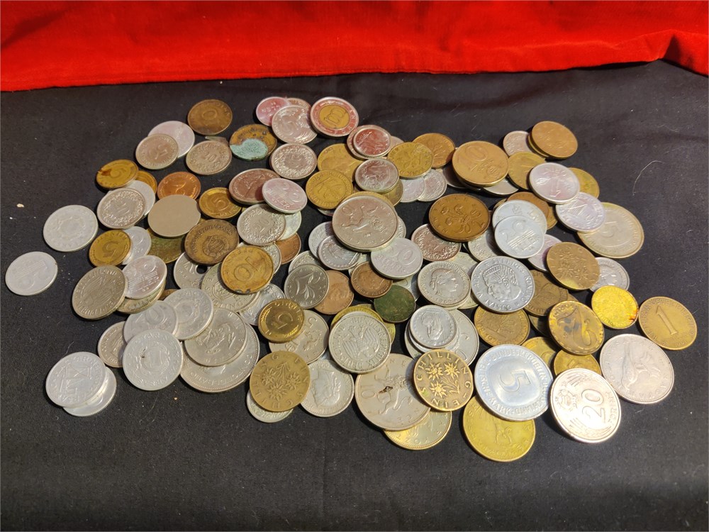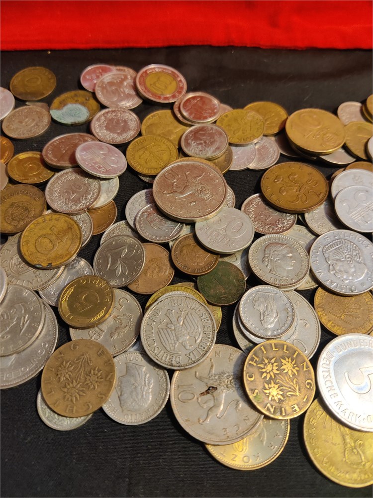 Large lot of foreign coins. All are from mid-1900s. I don't believe there are any silver coins in this lot.