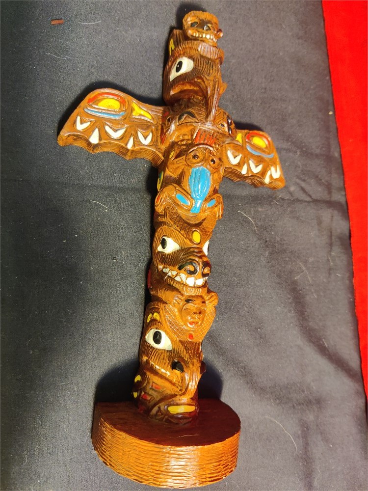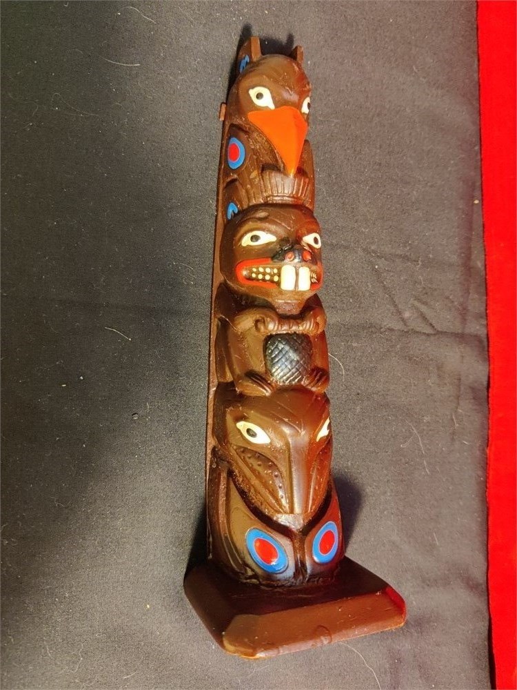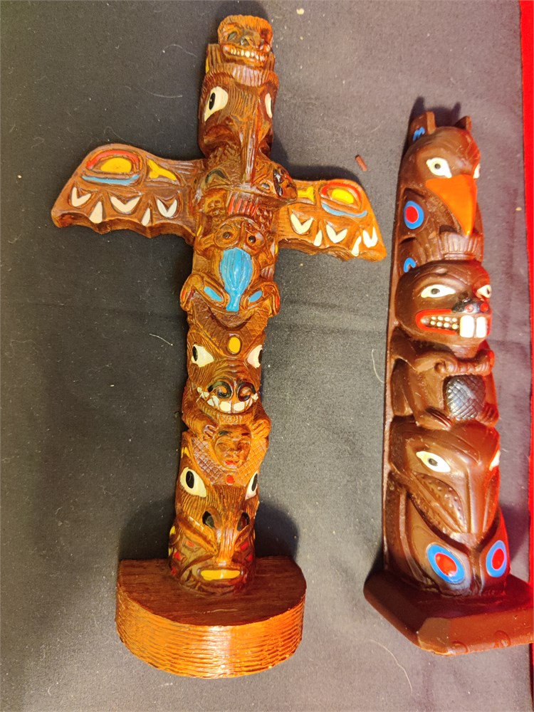 Nice pair of souvenir totem poles. The darker totem pole looks to be made from a hard plastic the other totem pole is resin. Both are approximately 9 in tall.