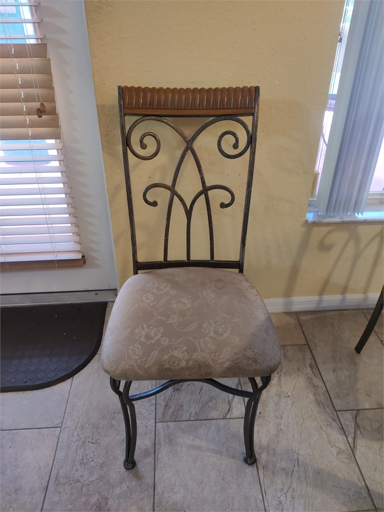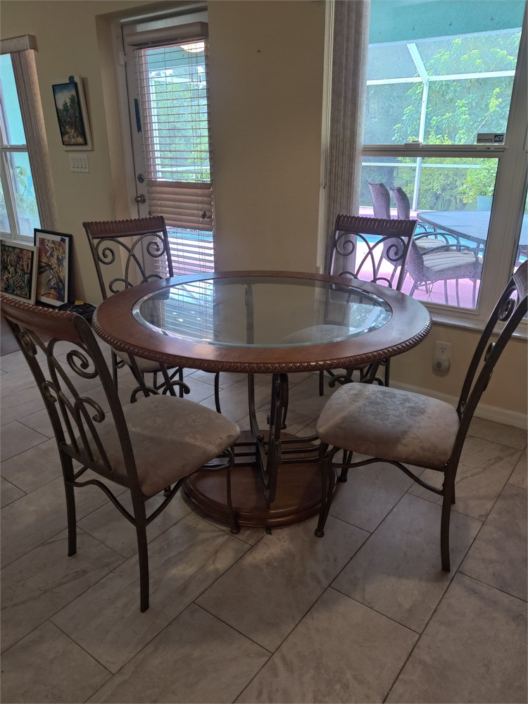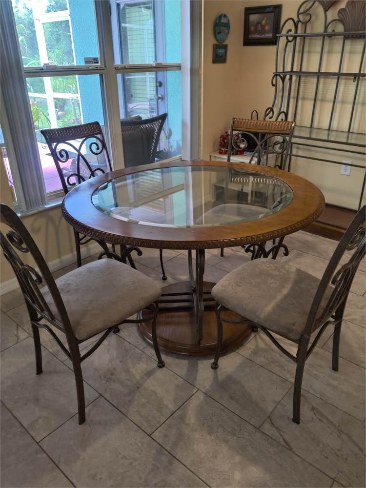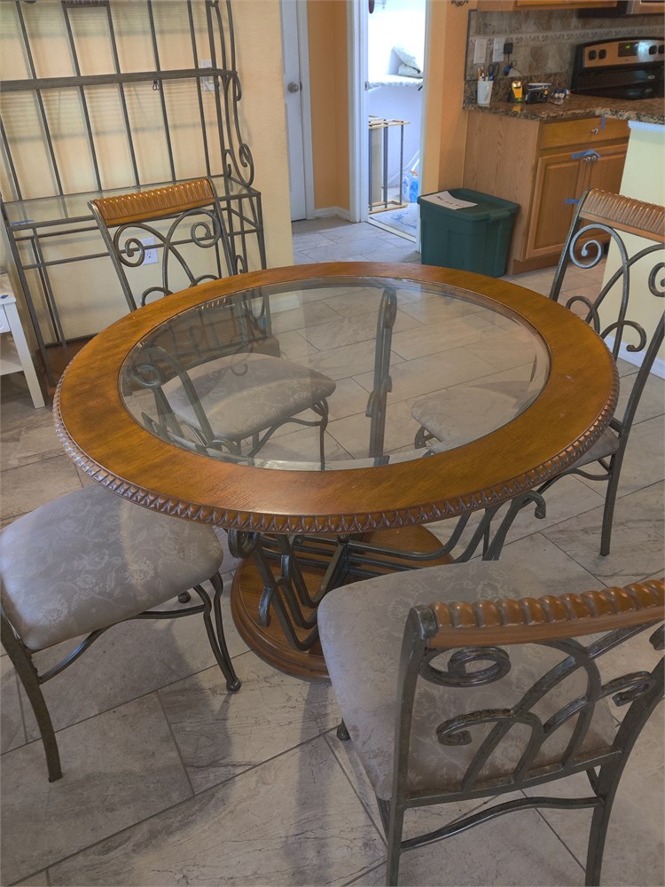 Nice glass Tom roundtable with four chairs. Table measures 45 in across center.