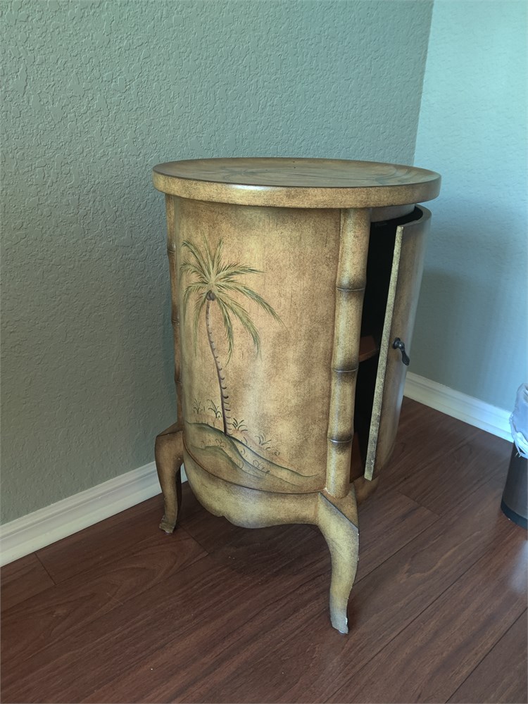 Nice coastal palm tree wood end table with underneath storage. Table is approximately 28 in tall and 18 in across center.