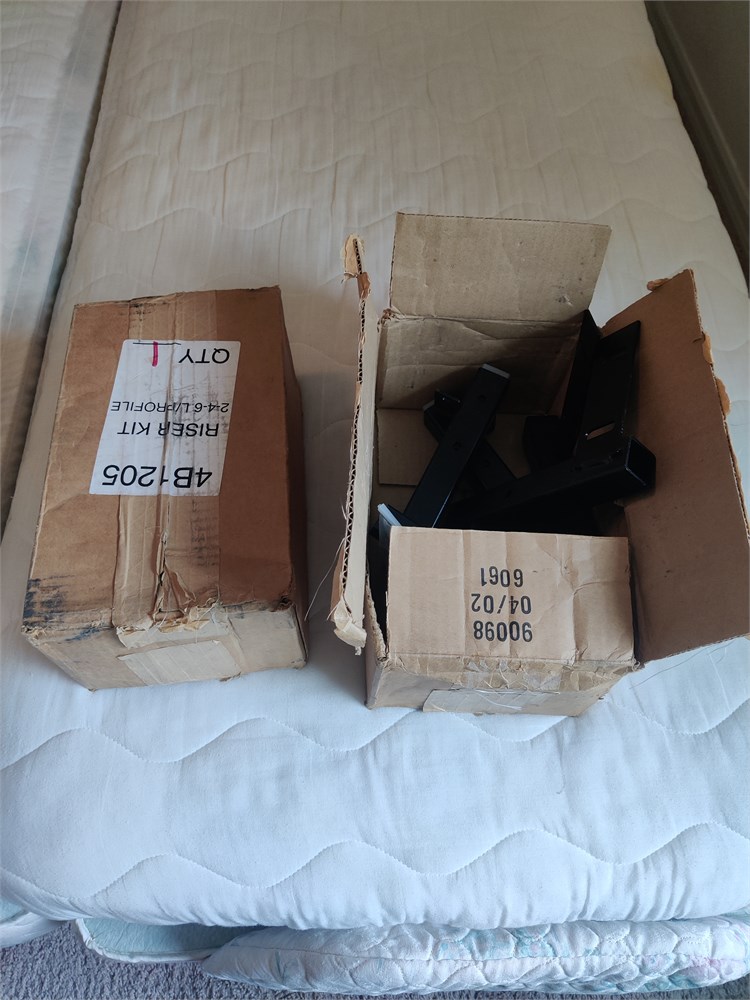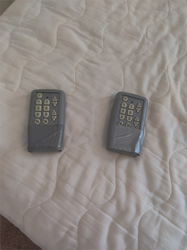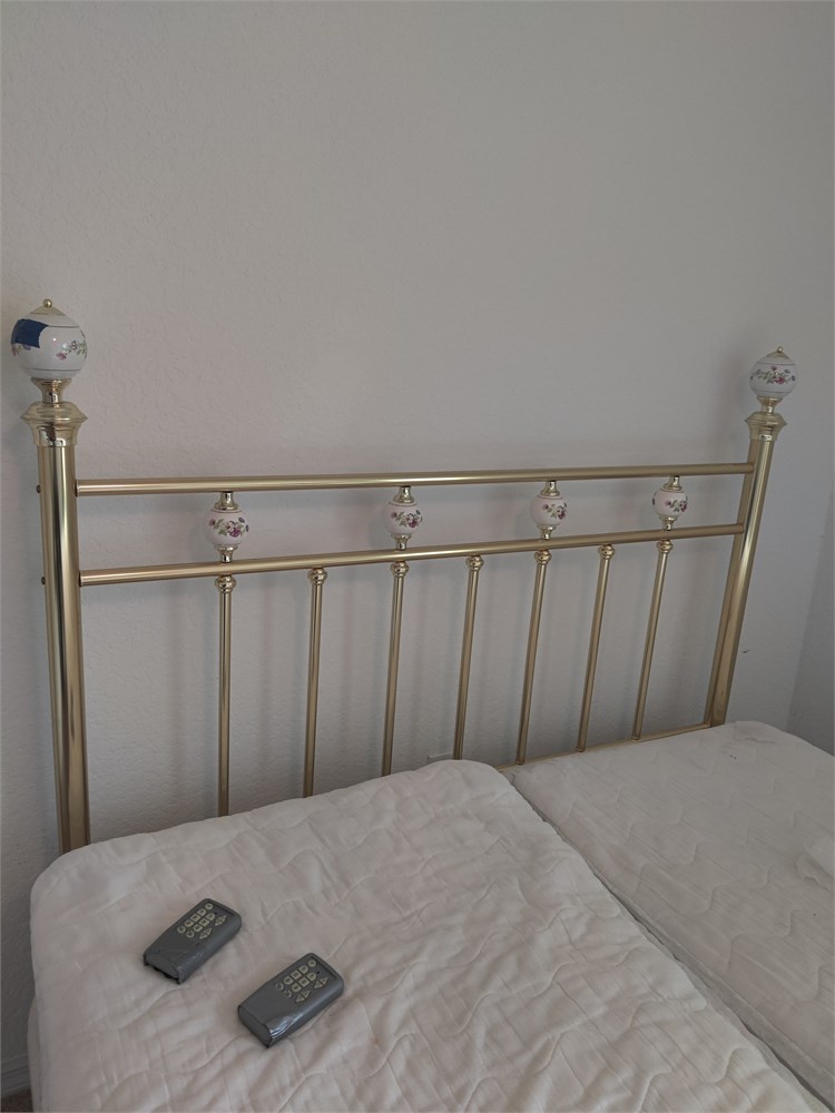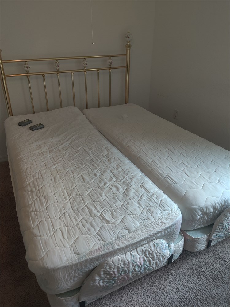 Two two electric adjustable beds. Top mattresses are in good used condition. This was kept in a spare room and not used much. Has remote controls and all the hardware. Includes Brass Headboard.
