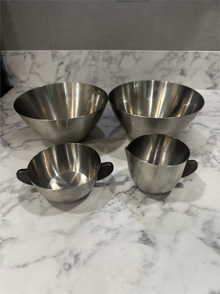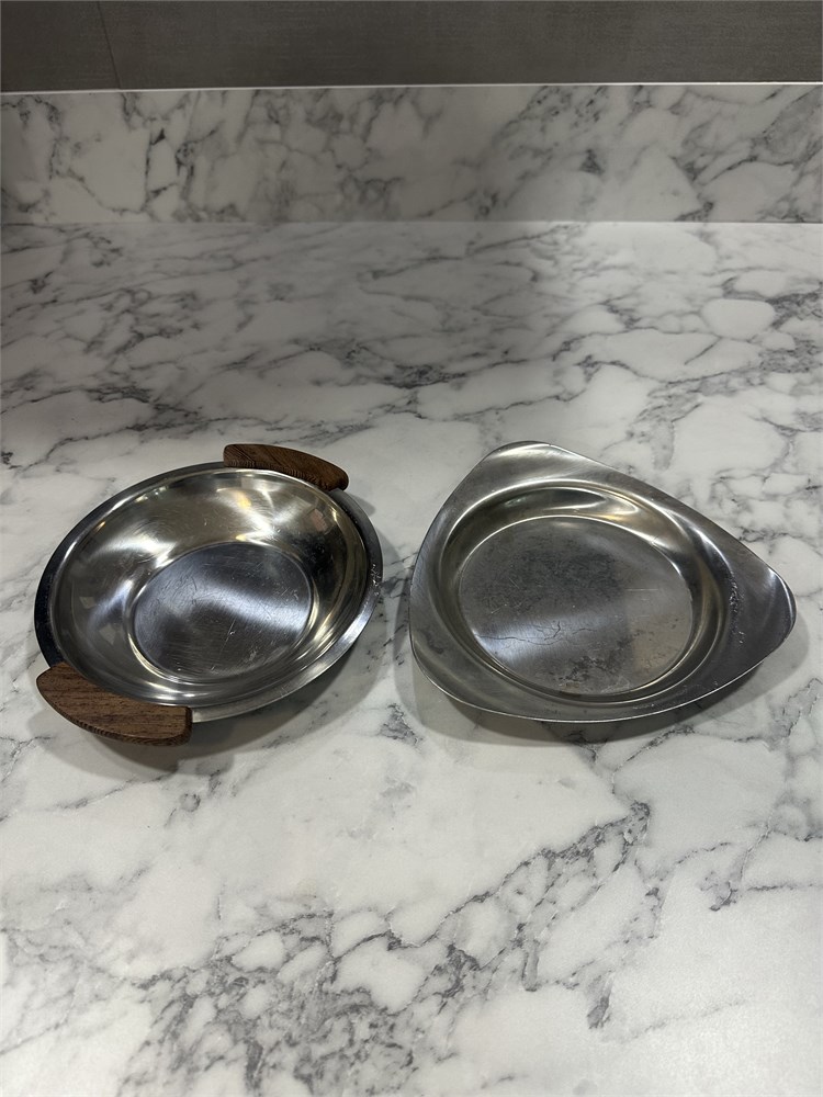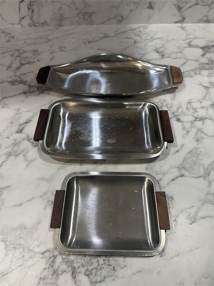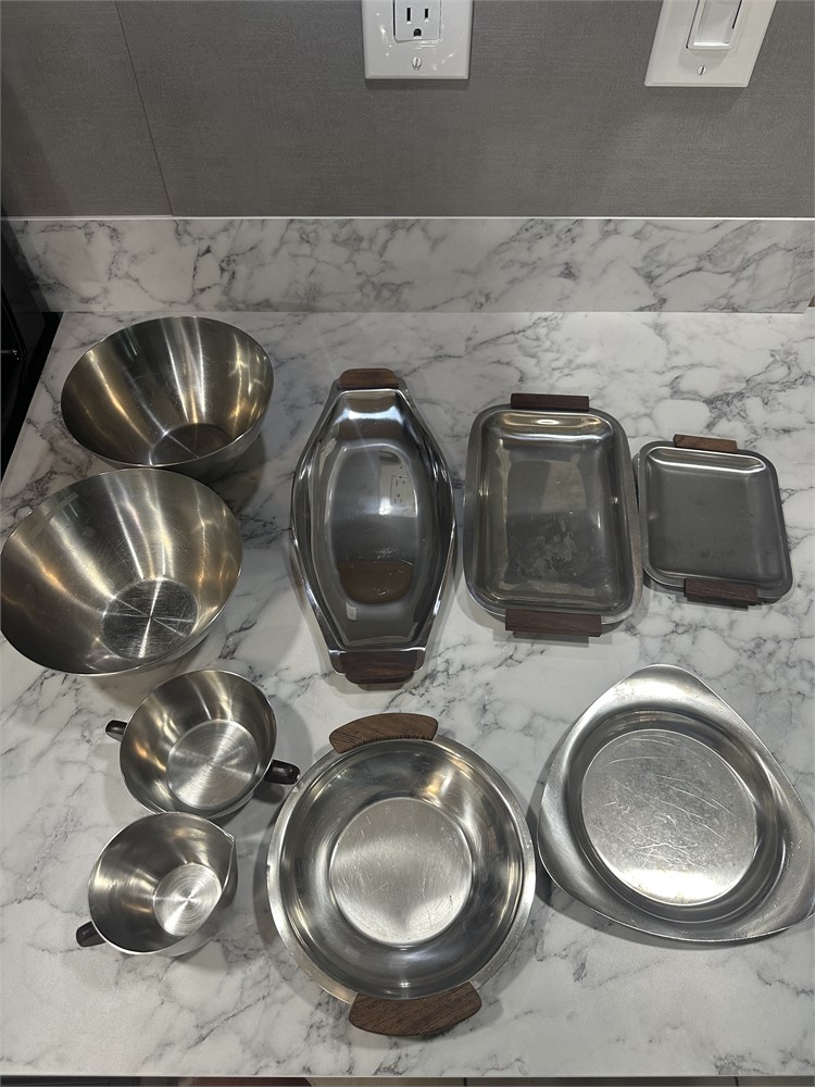 9 piece vintage danish, serving dishes and bowls. Stainless steel some with wooden handles. made from Denmark