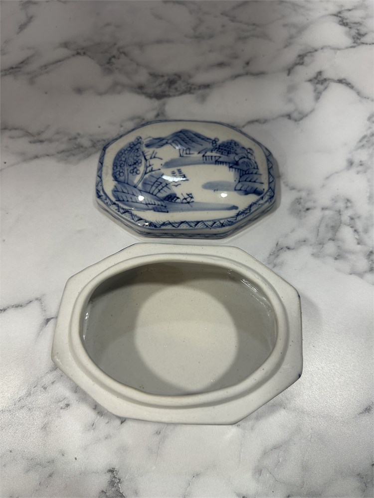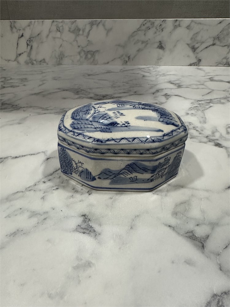 This is a vintage blue and white Chinoiserie porcelain trinket box