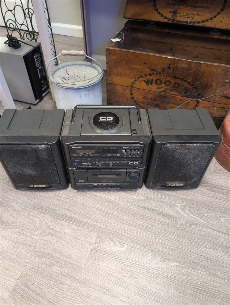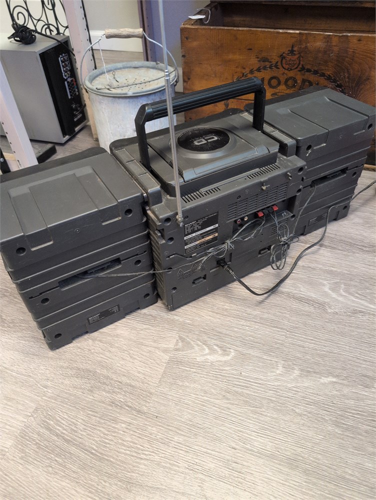 Works on batteries or plug, has been tested. Radio works fine. Fine. Did not test the CD or cassette. Was told by consignor they both work. It is complete. Antenna is good. Speakers are detachable, manufactured in 1991