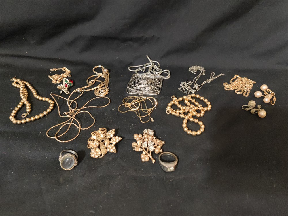 Nice lot of vintage costume jewelry. Includes a couple rings a couple brooches some earrings and necklaces.